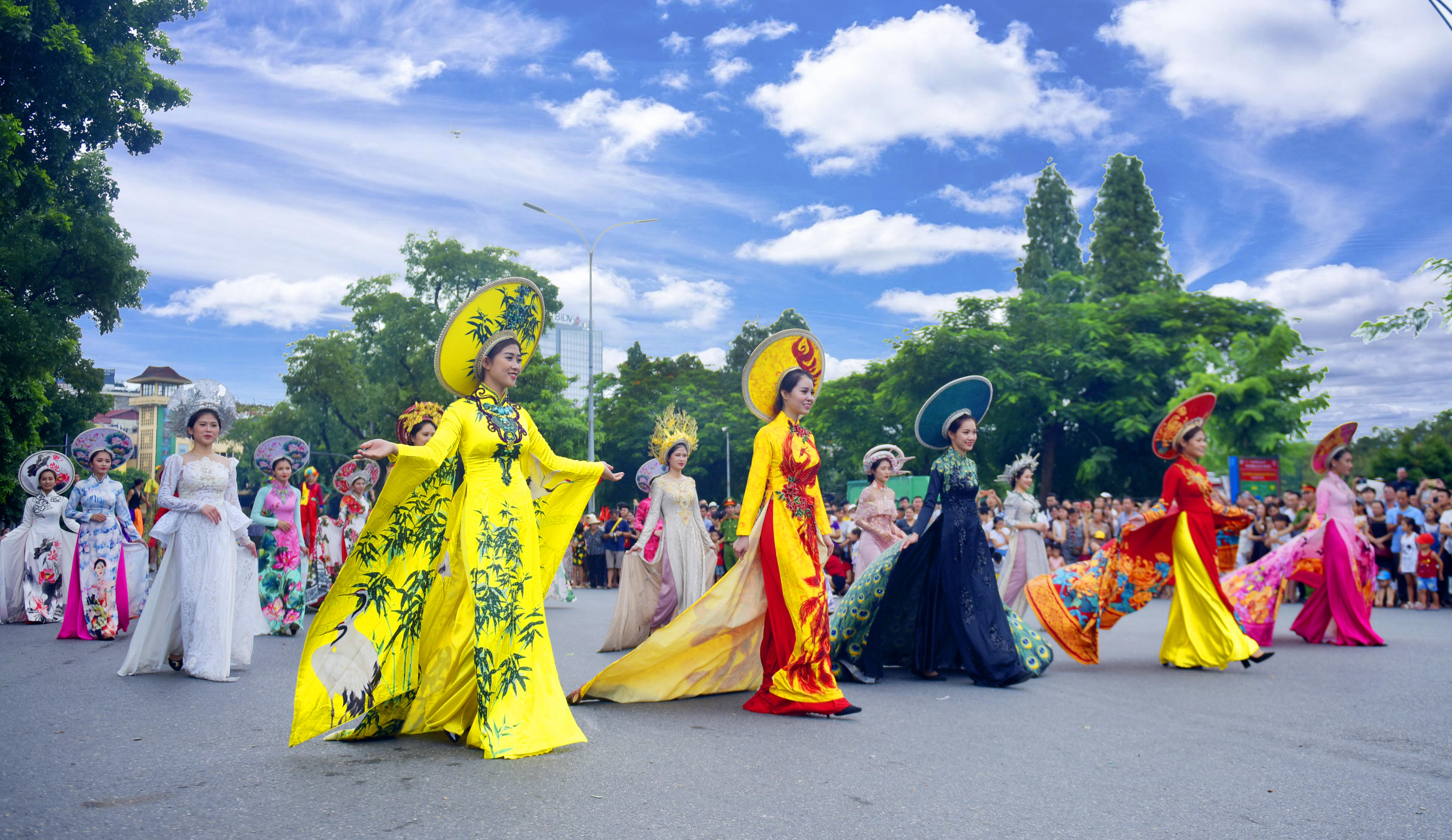 Trình diễn áo dài VN trên không gian phố đi bộ ở Hồ Hoàn Kiếm. Ảnh Phạm Hùng/Báo KTĐT |