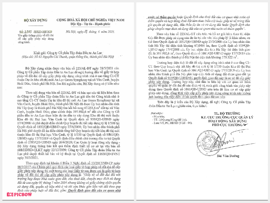Trước đó, tại văn bản ngày 23/2/2021, Sở TN&MT Hà Nội khẳng định: Lô đất xây dựng nhà cao tầng ký hiệu C1-CT thuộc dự án KĐT Đại học Vân Canh (nay là KĐT mới An Lạc Green Symphony tại xã Vân Canh và An Khánh, huyện Hoài Đức không nằm trong diện tích điều chỉnh giảm khi điều chỉnh tổng thể quy hoạch chi tiết 1/500 của dự án.