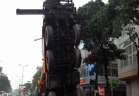 Hà Nội: Xe cần cẩu 50m “chổng vó” giữa đường