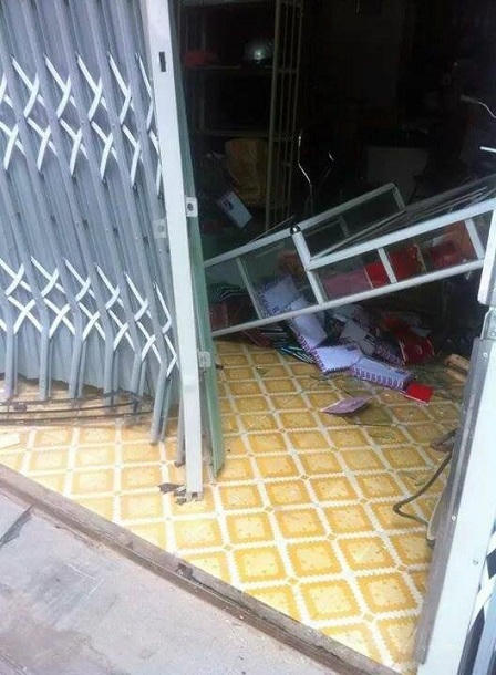 Sau cú va chạm mạnh, phần đầu bên trái của chiếc xe 4 chỗ đã bị móp méo nghiêm trọng, nhiều bộ phận rời ra ngoài. Riêng nhà số 10, phần cửa sắt kéo bị lún vào trong. Tủ kính đựng hàng hóa đặt ngay gần cửa cũng bị vỡ.