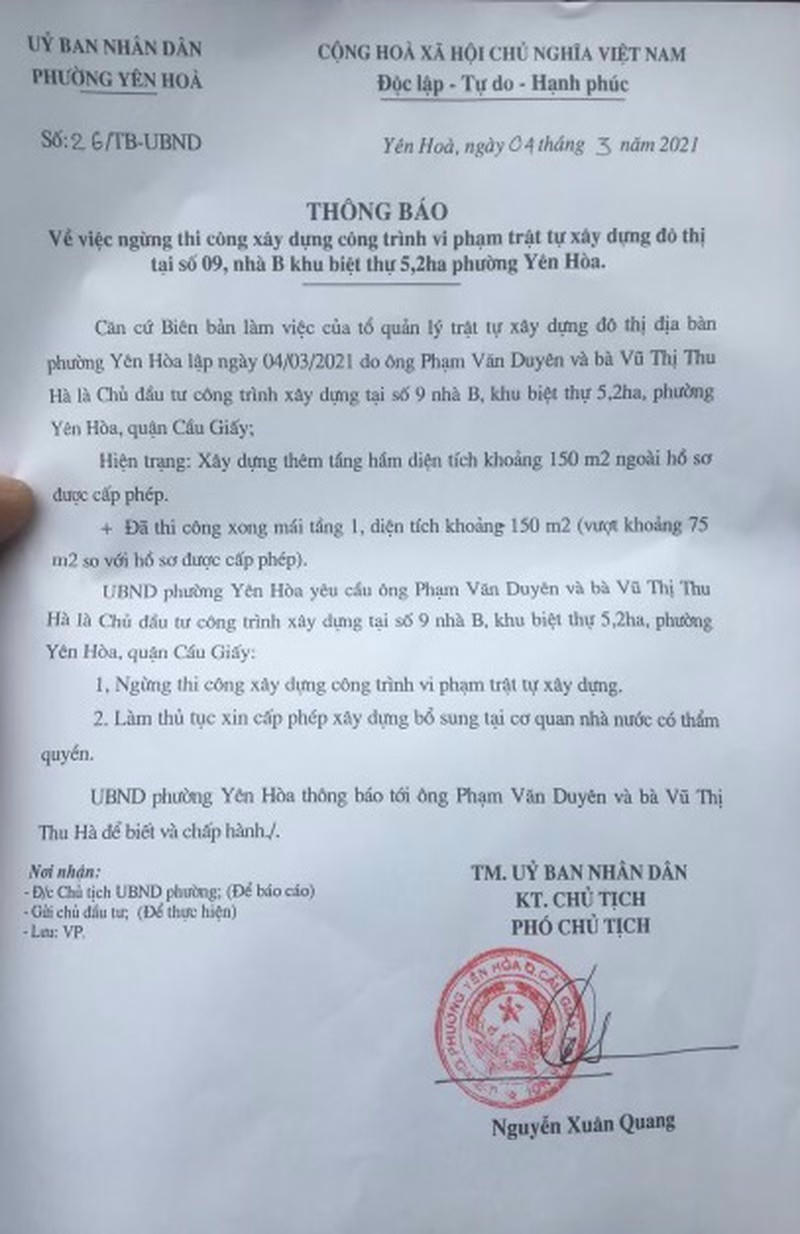 Trong số này, chủ đầu tư xây dựng công trình số 9, nhà B, khu biệt thự 5,2ha đã có vi phạm trong quá trình xây dựng như, xây dựng thêm tầng hầm diện tích khoảng 150m2 ngoài hồ sơ được cấp phép; thi công mái tầng 1 vượt quá 75m2 so với hồ sơ được cấp phép và để vật liệu xây dựng ngổn ngang gây ô nhiễm môi trường và cản trở người tham gia giao thông. Việc vi phạm trật tự xây dựng này đã bị chính quyền phường Yên Hòa lập biên bản, yêu cầu dừng thi công nhưng chủ đầu tư vẫn không chấp hành.