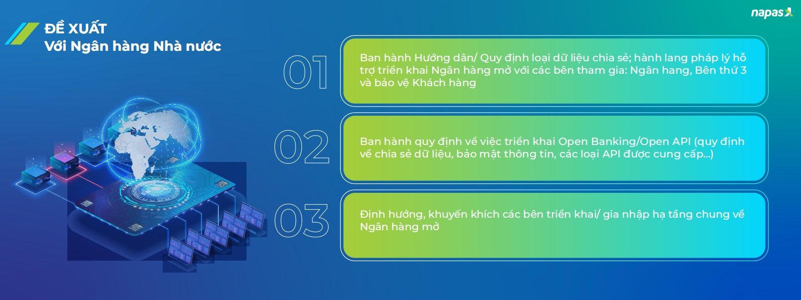 Theo đại diện NAPAS, hiện trên thế giới xu hướng hạ tầng chung về Ngân hàng mở ngày càng tăng, hạ tầng chung giúp thúc đẩy phát triển nhanh hơn kết nối tự phát, hạ tầng chung được cấp phép hoặc vận hành bởi các tổ chức/Hiệp hội lớn có uy tín, chẳng hạn như Ấn Độ (UPI/NPCI), Hàn Quốc (KFTC), Thuỵ Sỹ (Six Group) được bảo trợ bởi NHTW và Hiệp hội Ngân hàng/Fintech hoặc mô hình tại Anh được cấp phép bởi FCA và được bảo trợ bởi CMA và NHTW.