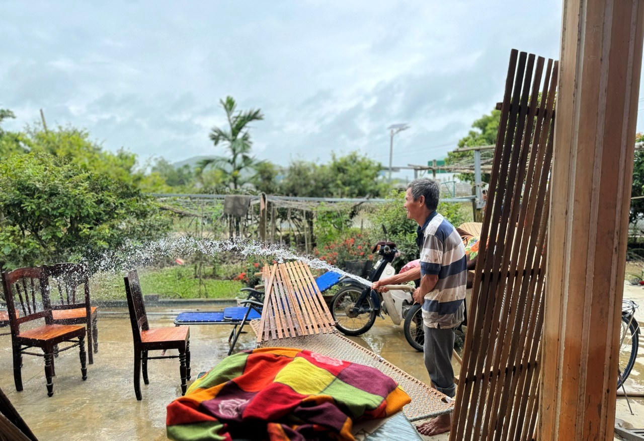 Người dân vùng ngập lũ ở thị xã Đức Phổ dọn dẹp nhà cửa ổn định cuộc sống. |