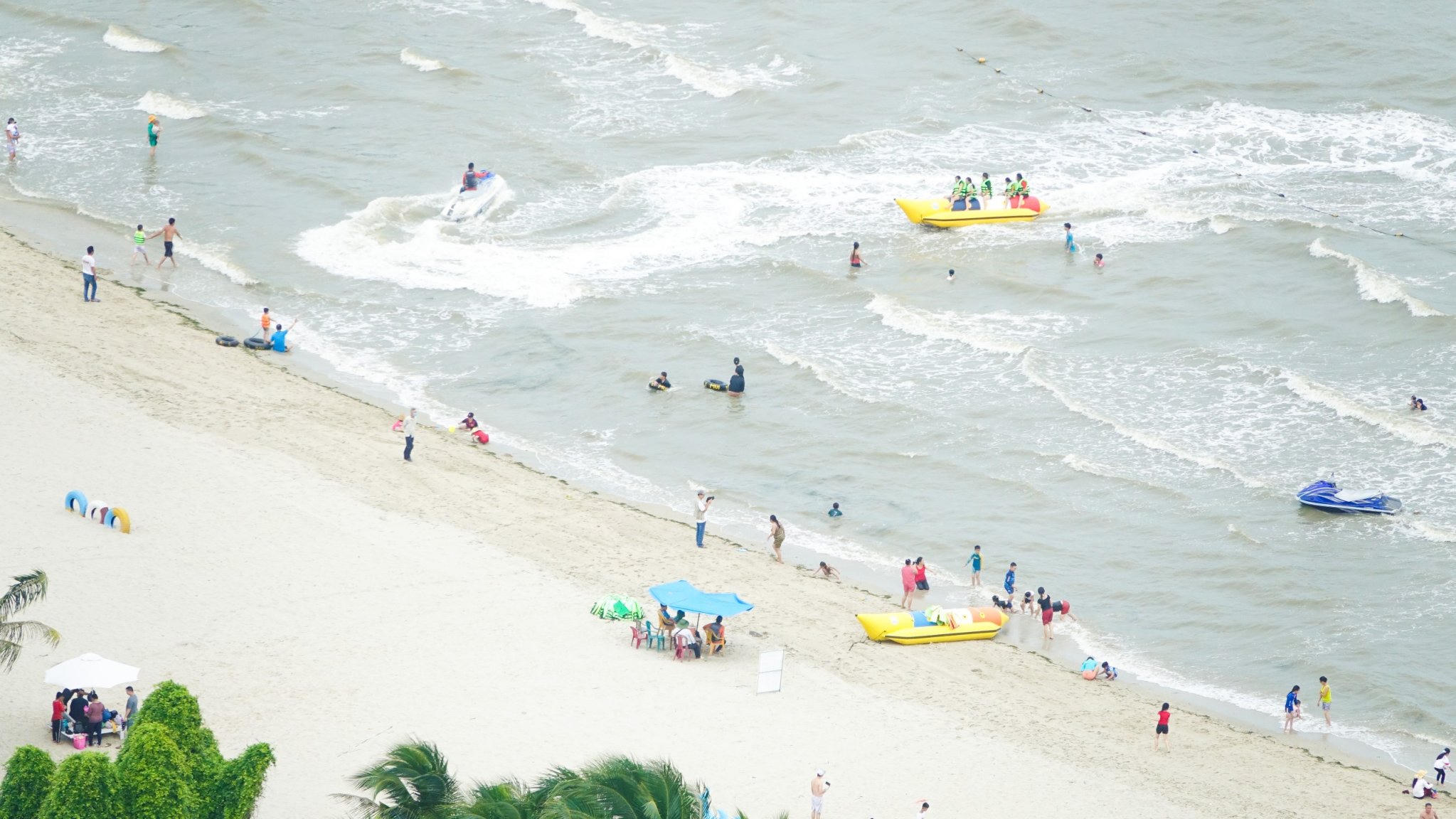 Du khách chơi các trò chơi thể thao trên biển tại TP Hà Tiên. |