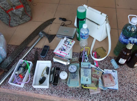 Bằng các biện pháp nghiệp vụ, tổ tuần tra phát hiện trên xe ô tô có một bộ coóng dùng để sử dụng ma túy đá, một bao ni lông đựng khoảng 4g ma túy đá; một dao găm có chiều dài 25cm; 1 cây kiếm tự chế dài 1m; 1 đao búa; 2 chai xăng; 55.975.000 đồng; 5 điện thoại cùng một số tang vật liên quan.