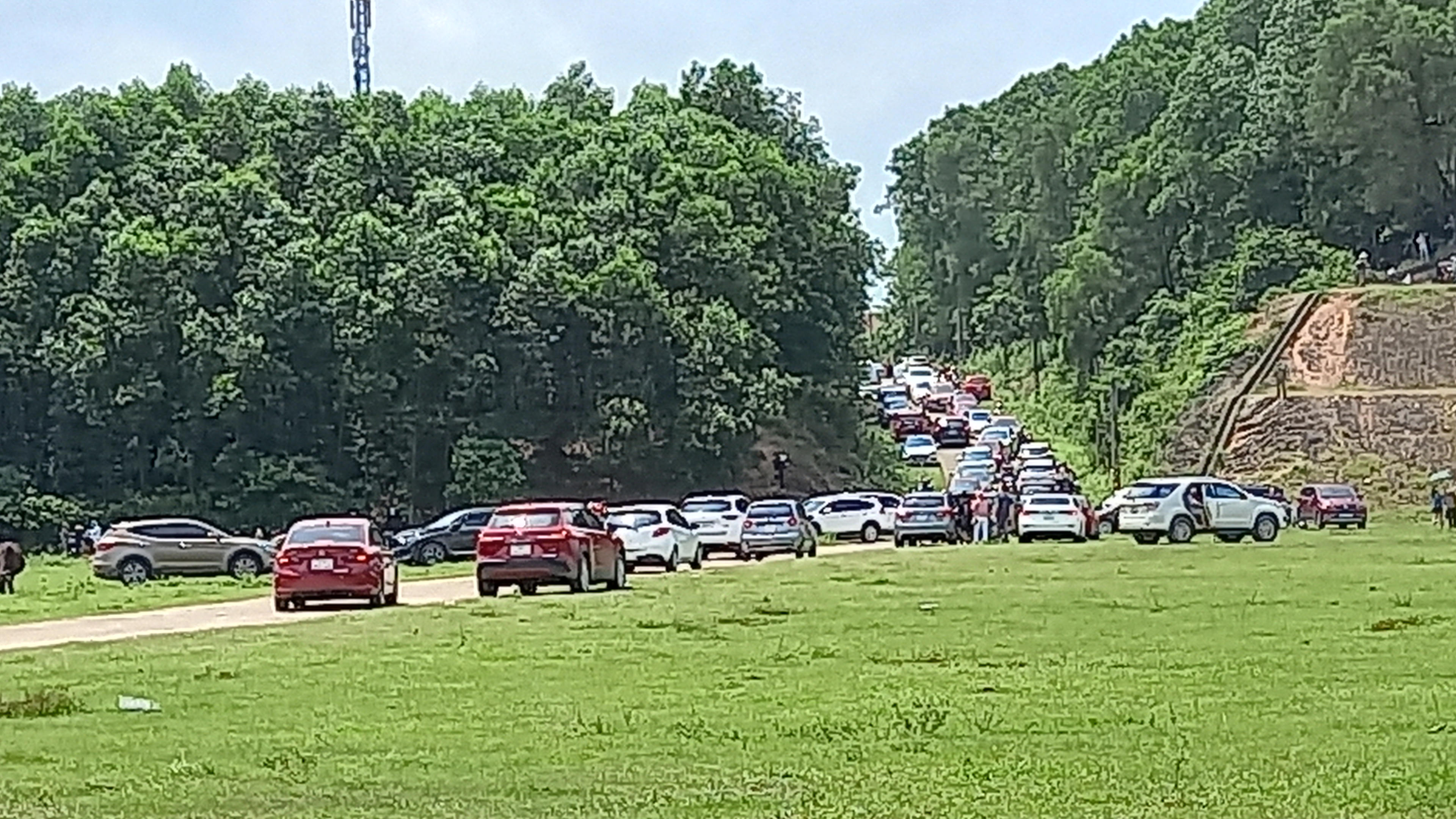 Ô Tô nối đuôi nhau từng hàng dài vào khu du lịch sinh thái hồ Kẻ Gỗ trong ngày 1/5/2023. |