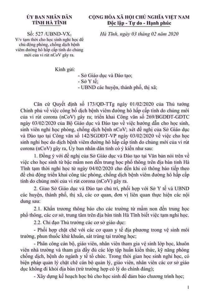 Theo công văn số 527/UBND-VX ngày 3/2, Chủ tịch Ủy ban nhân dân tỉnh Hà Tĩnh có ý kiến như sau: Đồng ý với đề nghị của Sở Giáo dục và Đào tạo về việc cho học sinh từ bậc mầm non đến trung học phổ thông trên địa bàn tỉnh Hà Tĩnh tạm thời nghỉ học từ ngày 04/02/2020 cho đến khi có thông báo tiếp theo để chủ động triển khai công tác phòng, chống dịch bệnh viêm đường hô hấp cấp tính do chủng mới của vi rút corona (nCoV) gây ra.