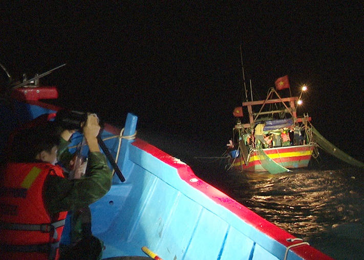 Lực lượng chức năng tuần tra, kiểm soát phát hiện tàu cá ông Bùi Quang khai thác hải sản trái phép trên biển. Ảnh: Thế Mạnh |