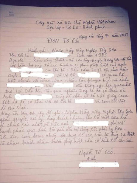 Theo đơn tố cáo, đầu năm 2017, anh P.D. A. (28 tuổi, trú tại xóm Kim Thành, xã Sơn Tây, huyện Hương Sơn) bắt quả tang vợ mình là chị L.T.H (24 tuổi) và anh Trần Quang V. (hiện là cán bộ Phòng kinh doanh của ngân hàng) ăn nằm với nhau trong một nhà nghỉ trên địa bàn và một lần khác tại nhà riêng của hai vợ chồng. Sau khi phát hiện vợ mình ngoại tình, anh A. đã nhiều lần khuyên bảo để giữ gìn hạnh phúc gia đình và đặc biệt là 2 con của vợ chồng còn quá nhỏ.