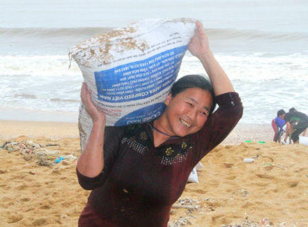 Trước việc được thiên nhiên ban tặng “lộc biển” người dân địa phương mỗi gia đình tập trung khoảng 5 thành viên ra bờ biển vớt sò lông. Những con sóng liên tục ập vào bờ mang theo “lộc biển” còn người dân người đưa bao tải, người đưa chậu ra hốt sò lông cười nói với nhau vui vẻ. Không khí vui tươi trong những ngày “được mùa” sò lông dường như đẩy lùi đi sự u ám, nỗi buồn các ngư dân đối với sự cố trường biển vừa qua.