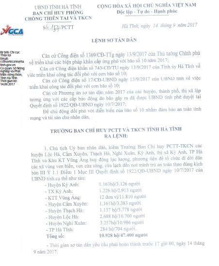 Nhận được Lệnh sơ tán dân yêu cầu Chủ tịch Uỷ ban nhân dân, kiêm Trưởng Ban Chỉ huy PCTT-TKCN các huyện: Lộc Hà, Cẩm Xuyên, Thạch Hà, Nghi Xuân, Kỳ Anh và Thị xã Kỳ Anh, TP Hà Tĩnh và Khu KT Vũng Áng, Thủ trưởng các ngành, các tổ chức và cá nhân chấp hành một cách nghiêm túc và báo cáo kết quả kịp thời về Văn phòng thường trực Ban chỉ huy PCTT-TKCN tỉnh.