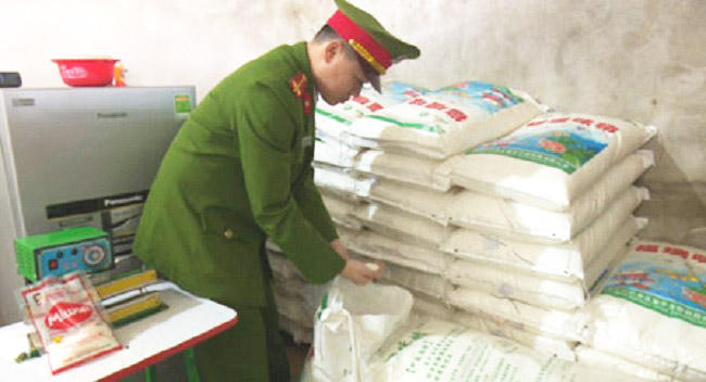 Khám xét tại nhà các đối tượng, cơ quan công an thu giữ 58 bao nguyên liệu in chữ Trung Quốc dùng để sản xuất mì chính giả với trọng lượng 1,45 tấn; 2 máy đóng gói bao bì và hàng trăm bao bì giả nhãn hiệu các hãng mì chính thông dụng.