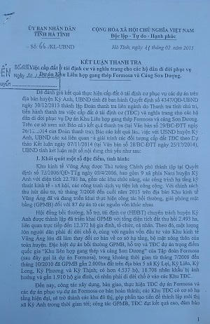 Kết luận thanh tra số 66 của UBND tỉnh Hà Tĩnh đã chỉ ra hàng loạt sai phạm trong việc cấp tái định cư (TĐC) tại 2 đại dự án trên. Theo đó, từ cuối năm 2009 đến hết năm 2013, các xã đã xét cấp đất cho 2.465 đối tượng. Kết quả thanh tra cho thấy lãnh đạo, quản lý phân công trách nhiệm giữa UBND, Hội đồng bồi thường (BT), hỗ trợ tái định cư (HTTĐC), giải phóng mặt bằng (GPMB) còn chồng chéo, bỏ sót công việc, thẩm quyền, thủ tục chưa hoàn chỉnh, vì vậy có những trường hợp cấp đất TĐC không đúng quy định, gây lãng phí, ảnh hưởng đến nguồn lực đầu tư.