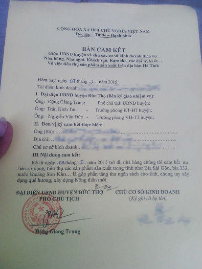 Tại huyện Đức Thọ, xuất hiện một cách làm “lạ”, đó là ông Đặng Giang Trung - Phó chủ tịch huyện Đức Thọ là người đại diện phía chính quyền ký với chủ các cơ sở kinh doanh bản cam kết về việc ưu tiên tiêu thụ bia Sài Gòn. Huyện Kỳ Anh có bản cam kết do Trưởng phòng Văn hóa – Thông tin huyện yều cầu các chủ kinh doanh ký cam kết với nội dung nhấn mạnh: “Kể từ ngày…nhà hàng tăng số lượng tiêu thụ sản phẩm bia Sài Gòn (bia Sài Gòn, bia 333), nước khoáng Sơn Kim và tiến tới việc “không tiêu thụ các hãng bia, nước khác”…”