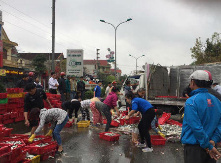 Hà Tĩnh: Xe chở cá bị lật ngang đường, người dân giúp tài xế thu gom