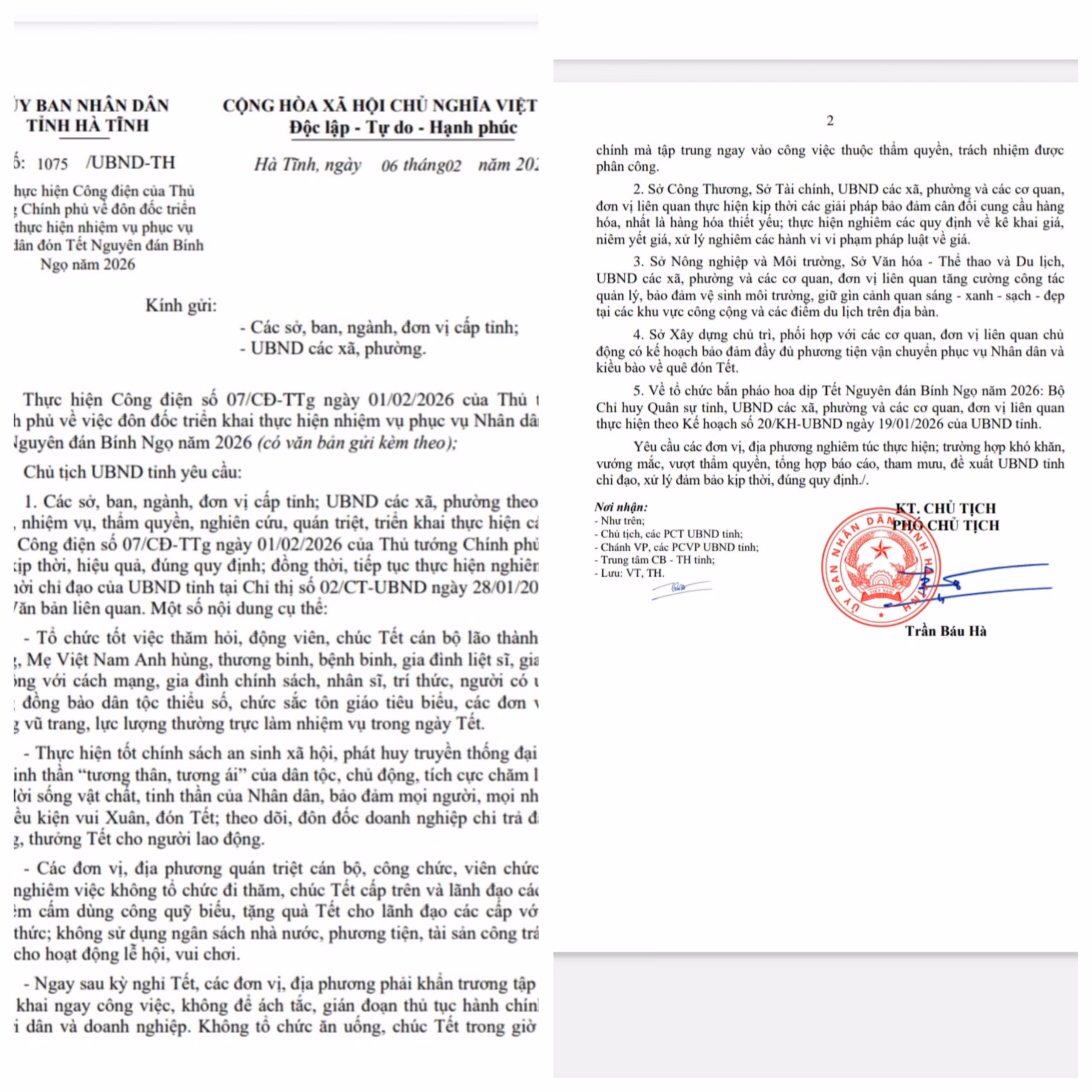 Với những chỉ đạo cụ thể, đồng bộ và quyết liệt của UBND tỉnh Hà Tĩnh thể hiện rõ quyết tâm tổ chức Tết Nguyên đán Bính Ngọ năm 2026 vui tươi, an toàn, lành mạnh, tiết kiệm; đồng thời siết chặt kỷ luật, kỷ cương hành chính, phòng ngừa tiêu cực, lãng phí. Qua đó góp phần bảo đảm an sinh xã hội, ổn định đời sống Nhân dân và tạo khí thế làm việc nghiêm túc, hiệu quả ngay từ những ngày đầu năm mới.