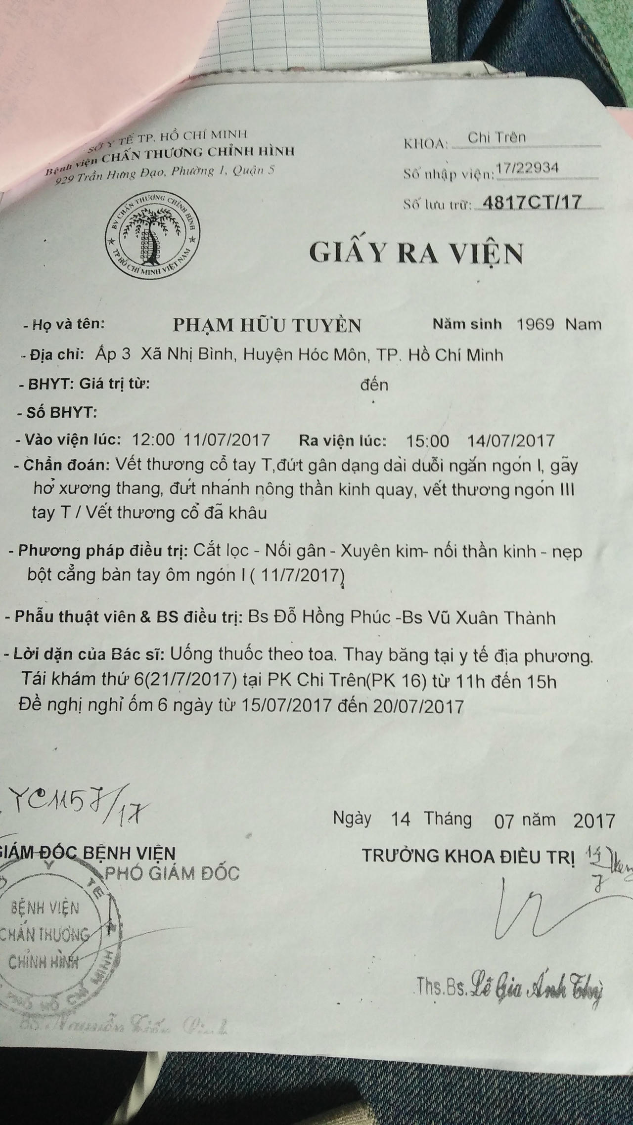 Có đơn yêu cầu của ông Tuyền, đến ngày 17/08, công an huyện Hóc Môn đưa ông Tuyền đi giám định thương tích làm cơ sở để xử lý. Tuy nhiên, đến nay đã hơn 1 tháng, ông Tuyền cho rằng không được cung cấp thương tích là bao nhiêu phần trăm. Ông Tuyền có đến trung tâm giám định pháp y để hỏi kết quả thì được trả lời đã chuyển cho công an huyện Hóc Môn. Nhưng khi ông đến công an huyện Hóc Môn thì không được trả lời.