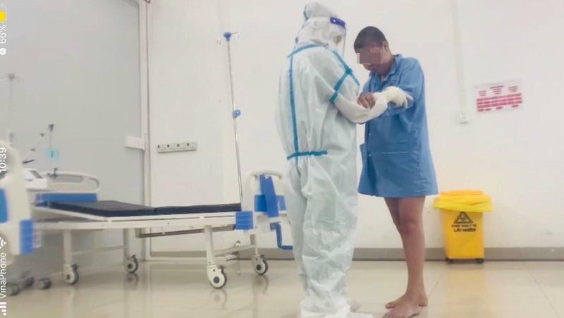 Dưới sự hỗ trợ tích cực của điều dưỡng Trung tâm Hồi sức COVID-19 Trung ương tại Long An (Trung tâm, trực thuộc Bệnh viện Trung ương Thái Nguyên), người bệnh - sản phụ Nguyễn Cẩm T. (phường Tân An, thành phố Long An) đang tập đi lại sau nhiều ngày nằm trên giường bệnh …