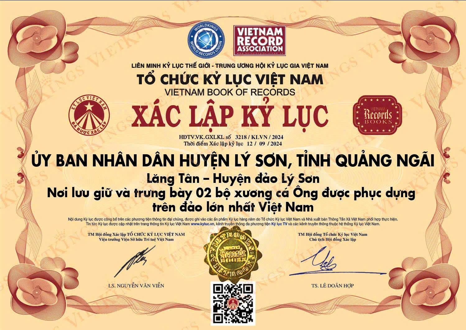 Ngày 17/9, bà Phạm Thị Hương, Chủ tịch UBND huyện đảo Lý Sơn (Quảng Ngãi) thông tin, Tổ chức kỷ lục Việt Nam đã xác nhận huyện Lý Sơn đang lưu giữ, trưng bày 2 bộ xương cá Ông được phục dựng lớn nhất Việt Nam.