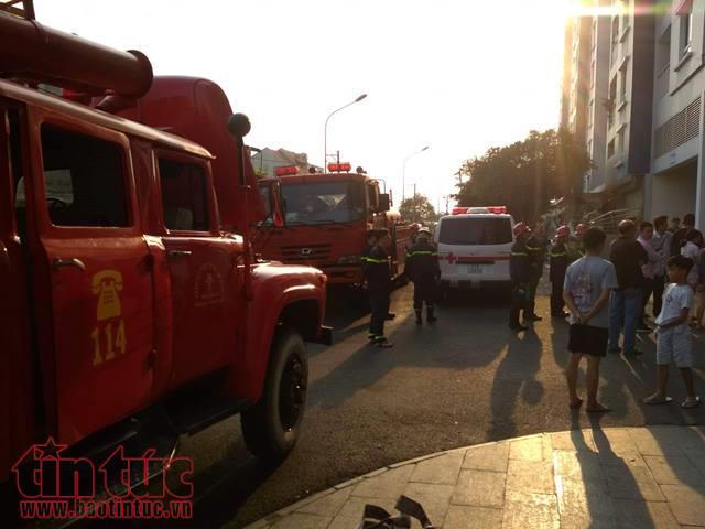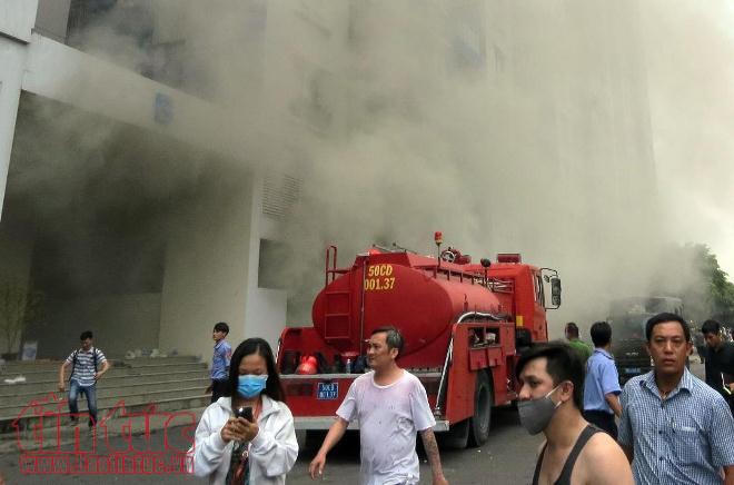 Chung cư Carina trưa nay phát cháy trở lại, khói bốc ra nghi ngút khiến nhiều người hoảng sợ và làm 2 cảnh sát bị thương.