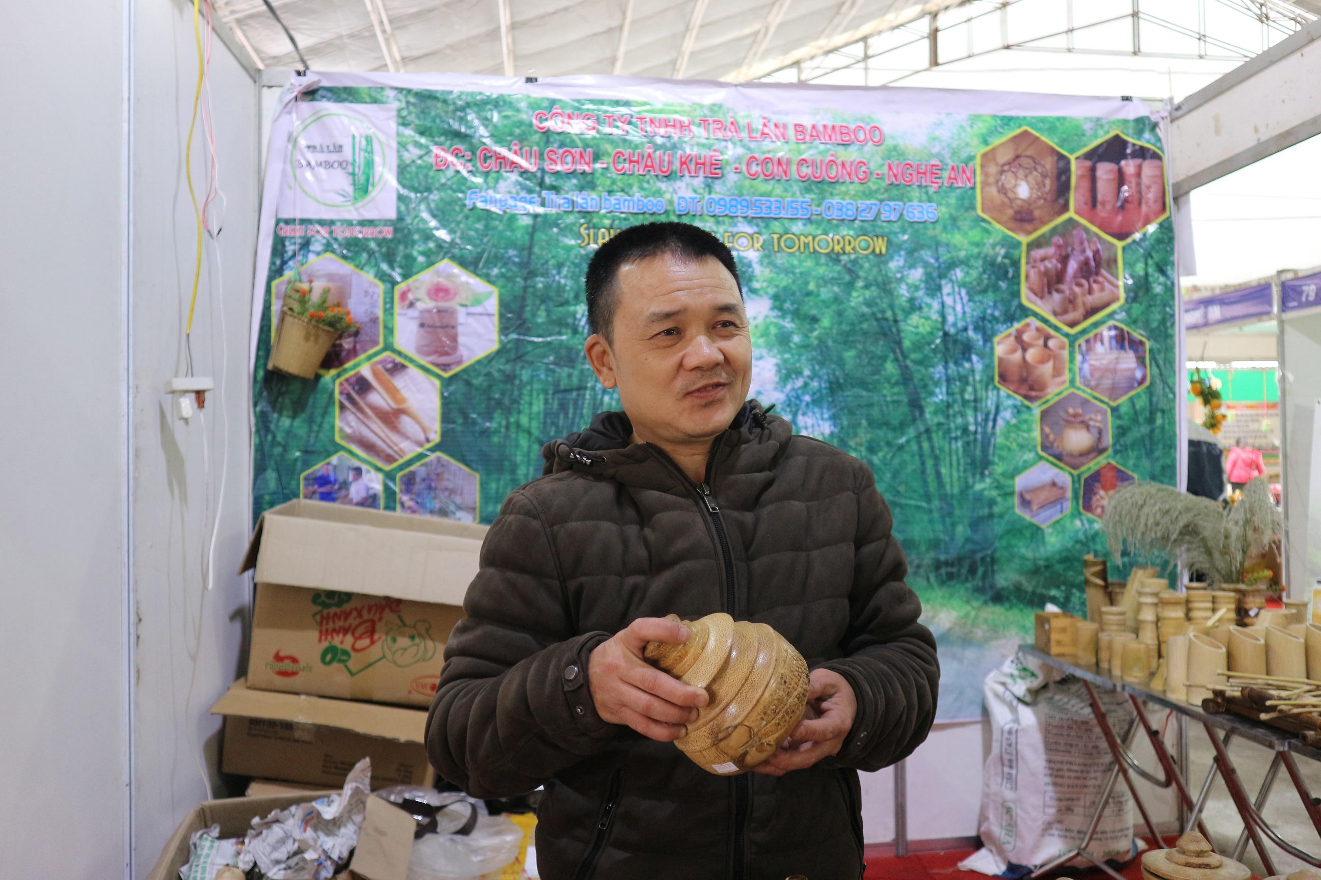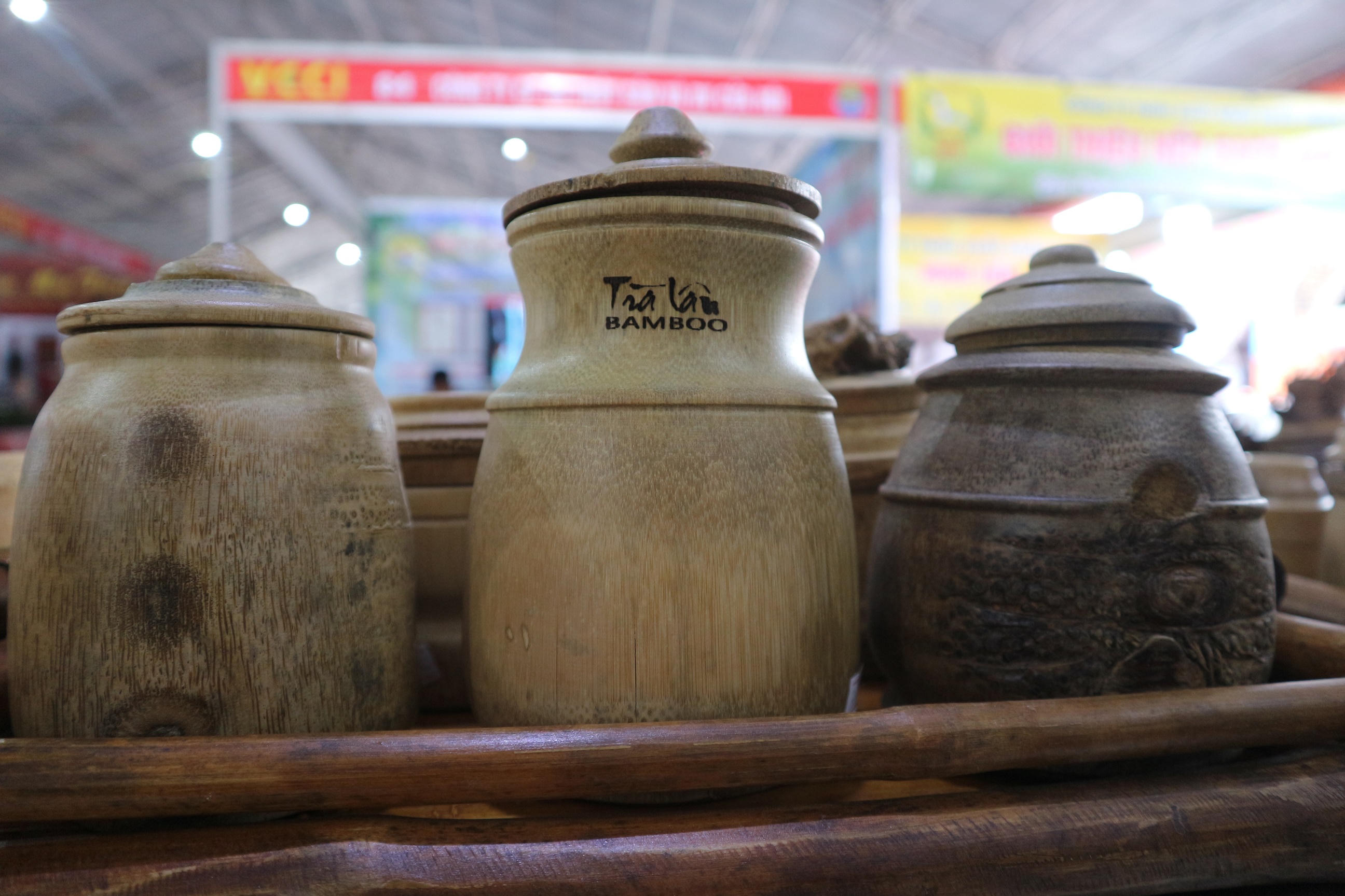 Tại Hội chợ Công thương vùng Bắc Trung bộ 2020 mới diễn ra tại TP Vinh (tỉnh Nghệ An), có một gian hàng khá đặc biệt, trưng bày bình trà, cốc chén, khay nước, hộp tăm…được làm từ cây tre thu hút sự chú ý của nhiều người. Hai nam nhân viên bán hàng, kiêm giới thiệu sản phẩm cũng chính là những người thợ đã tạo ra những bình trà, cốc chén ấy.