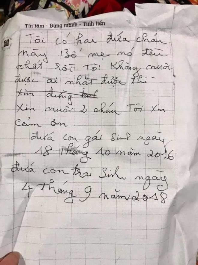Chị Bích kiểm tra bên trong chiếc túi cháu đang giữ thì thấy quần áo, giày dép và một số đồ dùng. Còn cháu Quỳnh Anh có lấy trong túi quần ra số tiền 1,2 triệu đồng và một bức thư viết tay có nội dung: "Tôi có hai đứa cháu này, bố mẹ nó đều đã chết rồi, tôi không nuôi được, ai nhặt được thì xin nuôi hai cháu giúp tôi...".