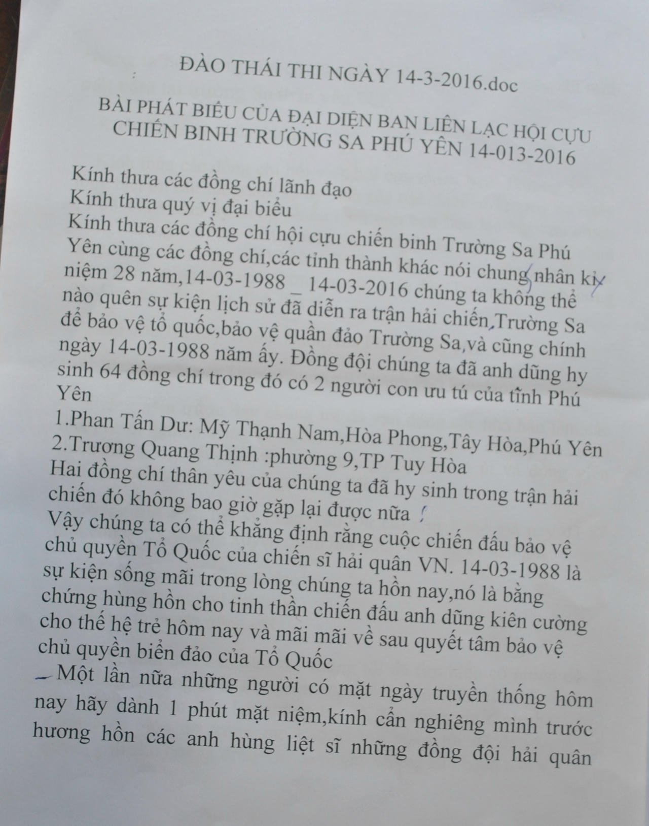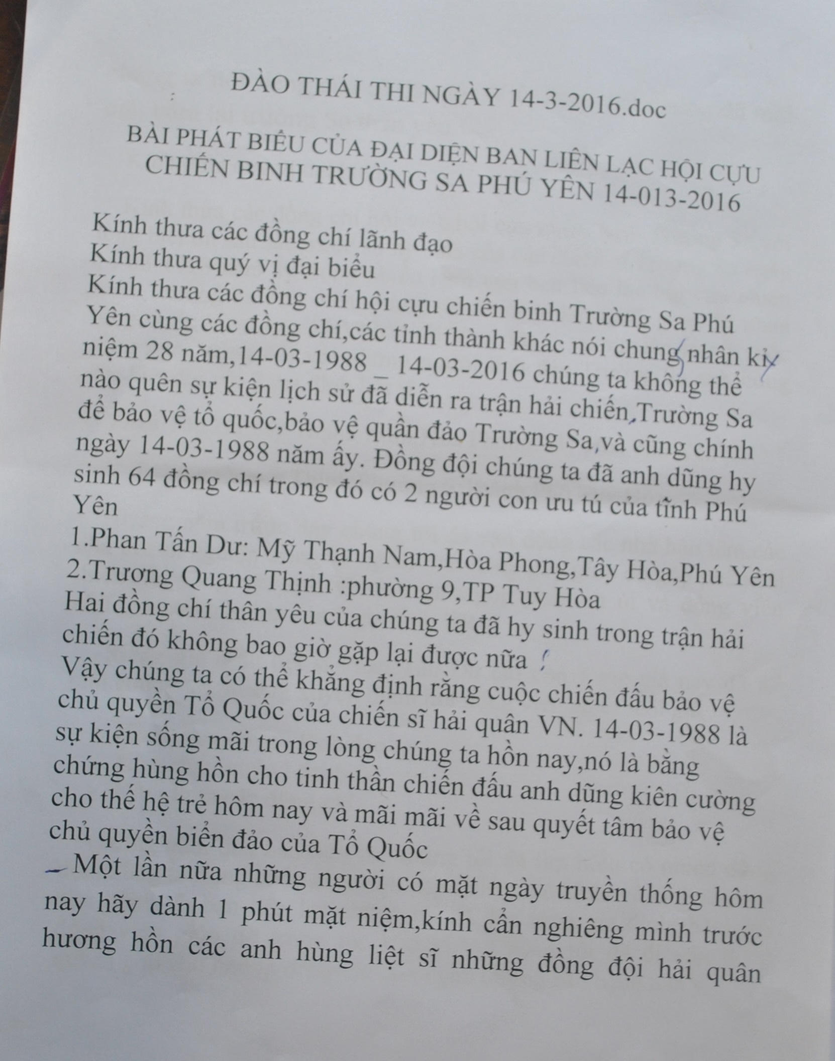 Trong sắp giấy anh Thi đang để trên bàn có bài phát biểu của anh nhân gặp mặt 28 năm cựu binh Gạc Ma tại Phú Yên (1988 - 2016). Ở đó, có tên 2 liệt sĩ Trương Văn Thịnh và Phan Tấn Dư.