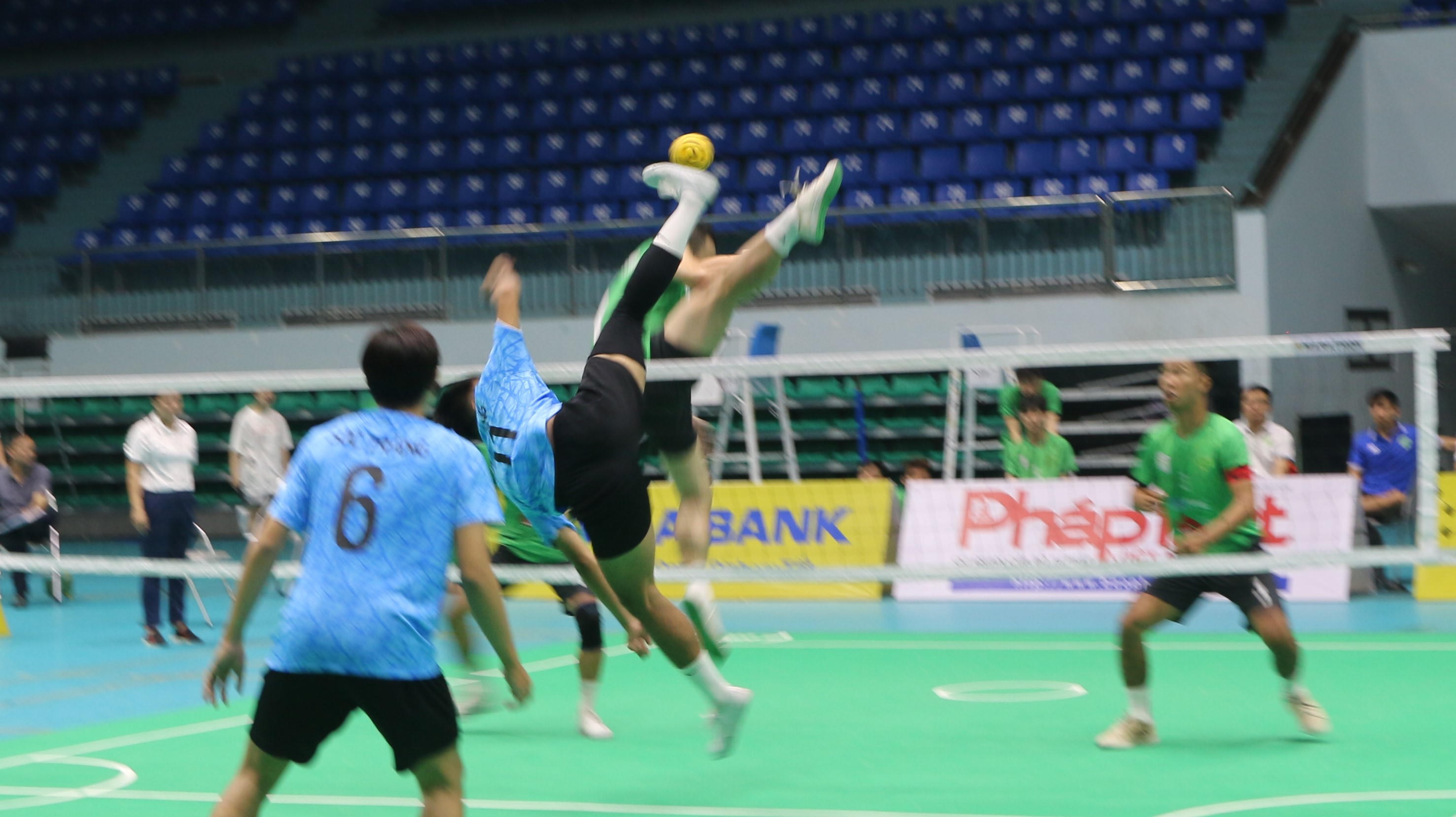 Một pha tranh chấp trên không của Vĩnh Long và Đồng Nai trong nội dung đồng đội 3 nam |