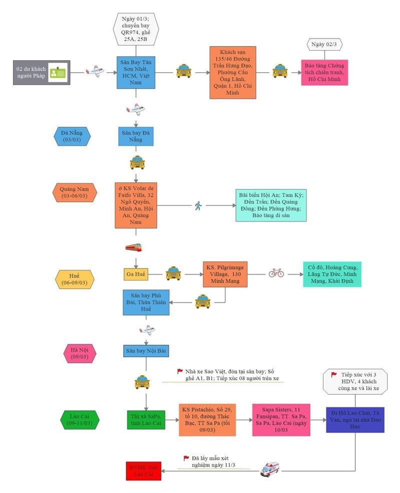 Cơ quan chức năng cũng xác định được 58 trường hợp tiếp xúc trực tiếp và gián tiếp với 2 du khách. Tất cả đã được cách ly, theo dõi đúng quy định. Lực lượng y tế địa phương cũng tổ chức khử trùng các địa điểm mà 2 du khách từng đặt chân.