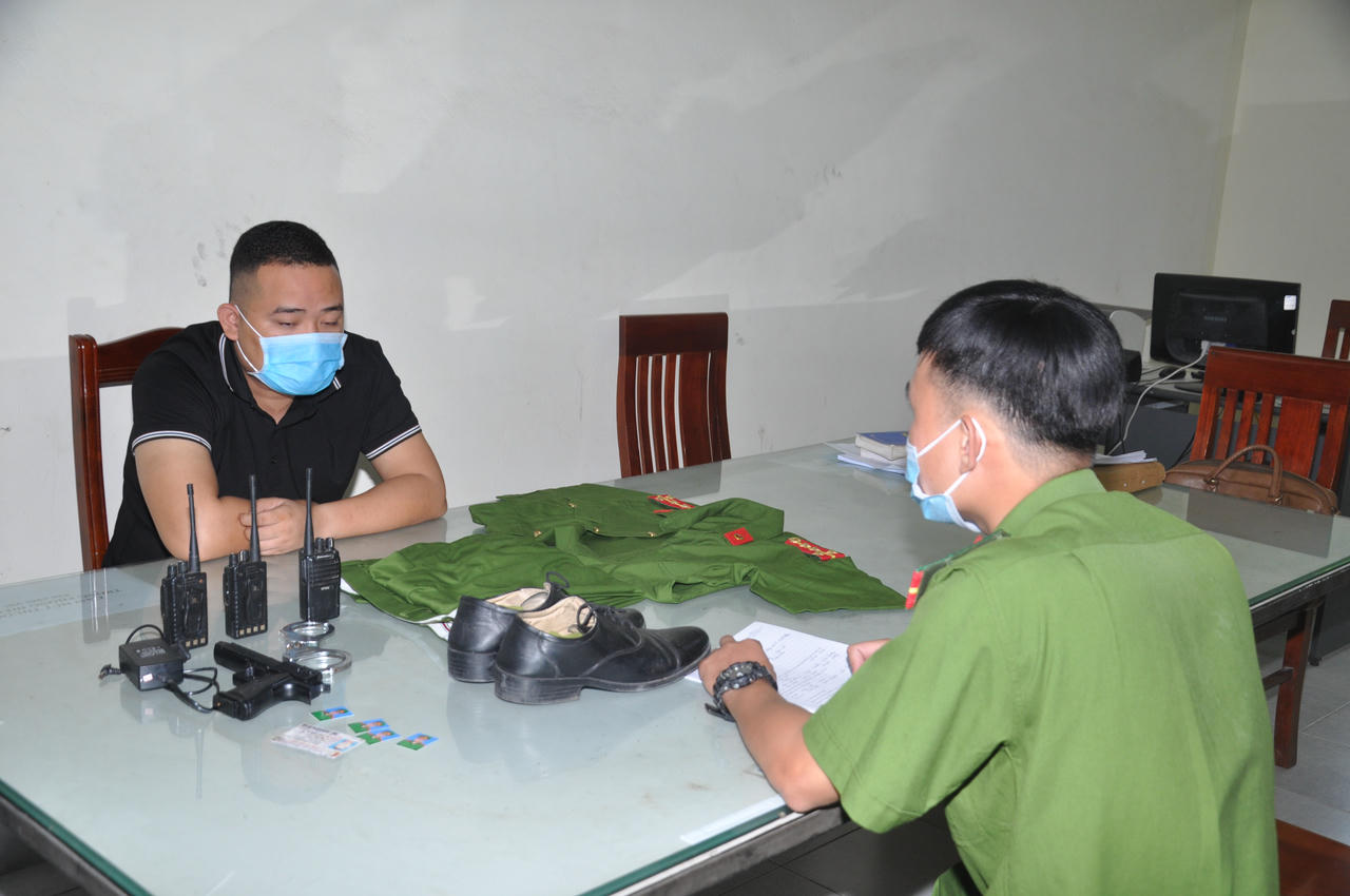 Sau khi tiến hành kiểm tra, lực lượng công an phát hiện đối tượng Thứ có mang theo 01 bộ quân phục Cảnh sát nhân dân xuân hè, trên áo gắn ve và cầu vai cấp hàm Đại úy, 01 đôi giầy màu đen có ghi dòng chữ “Tổng Cục Hậu Cần Công ty Cổ phần 26”, 01 đôi tất màu xanh; 01 khóa số 8; 03 bộ đàm; 04 ảnh kích thước 3x4cm hình nam thanh niên mặc trang phục xuân hè Cảnh sát nhân dân, đầu đội mũ kê pi; 01 vật dạng súng ngắn màu đen và một số giấy tờ khác.