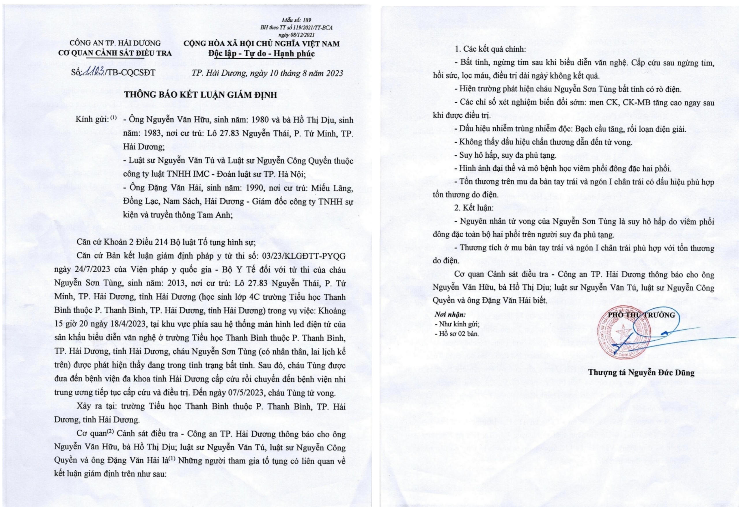 Trong khi đó, tại Thông báo kết luận giám định số 832/TB-CQCSĐT ngày 2/6/2023 của Công an TP Hải Dương có nội dung: Nơi phát hiện ra cháu Tùng bất tỉnh là tại khu vực phía sau hệ thống màn hình led điện tử của sân khấu biểu diễn văn nghệ ở Trường Tiểu học Thanh Bình. Cháu Tùng được phát hiện trong tình trạng bất tỉnh. “Sau đó, cháu Tùng được đưa đến Bệnh viện Đa khoa tỉnh Hải Dương cấp cứu rồi chuyển đến Bệnh viện Nhi Trung ương tiếp tục cấp cứu và điều trị. Đến ngày 7/5/2023, cháu Tùng tử vong”.