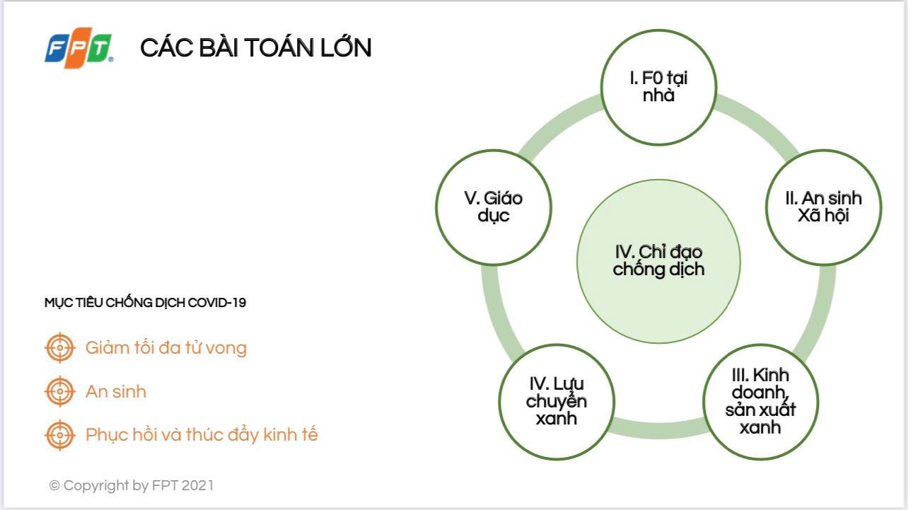 Tại buổi Hội thảo, giải pháp chuyển đổi số tổng thể cũng đã được các chuyên gia của FPT trình bày bao gồm 6 thành tố chính gồm: Giải pháo chỉ đạo xanh, An sinh xã hội xanh, Quản lý và chăm sóc F0 tại nhà, Doanh nghiệp xanh, Lưu chuyển xanh và Giáo dục xanh.