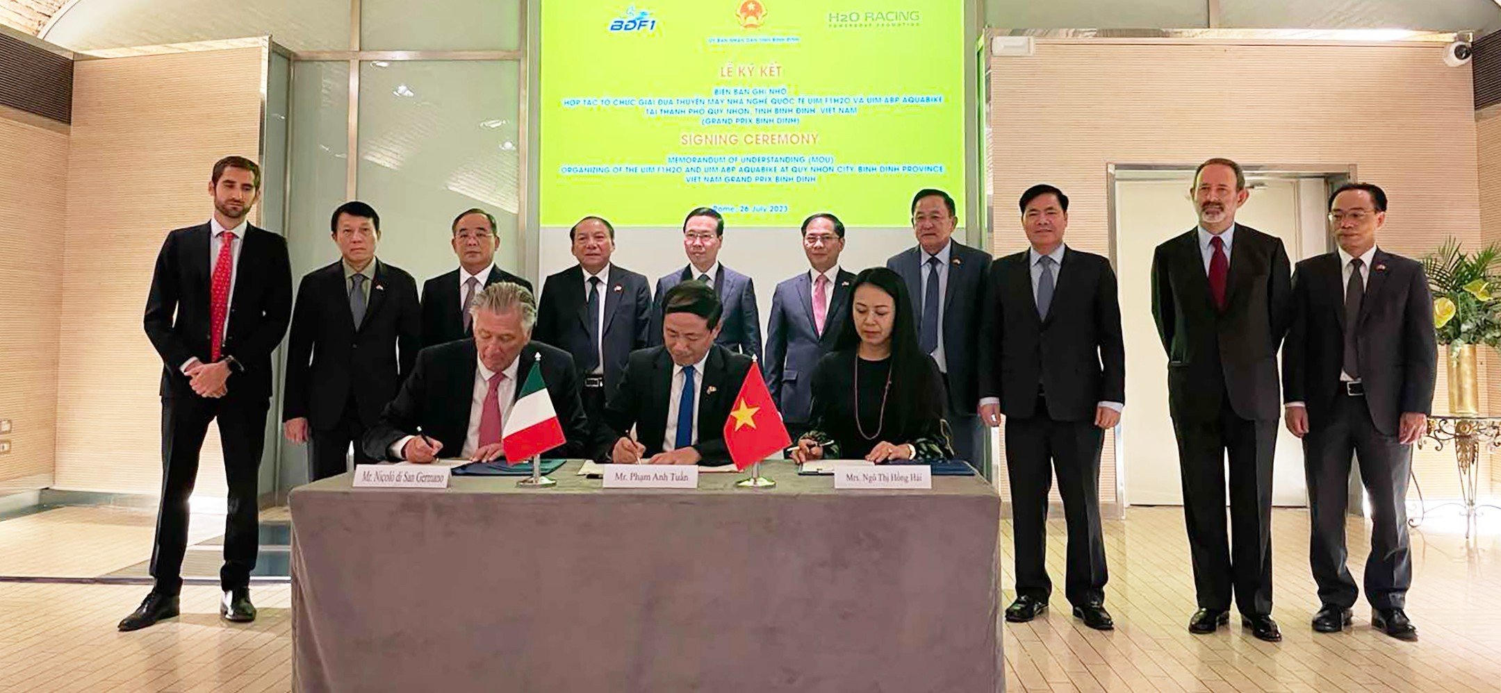 (PLVN) - Ngày 26/7, Chủ tịch UBND tỉnh Bình Định Phạm Anh Tuấn cùng Công ty Cổ phần F1 Bình Định (BDF1, có trụ sở chính tại TP Quy Nhơn) là chi nhánh của H2O Management LTD (H20 Racing) - Đơn vị thực hiện của UIM F1H2O có trụ sở chính tại Ý đã ký biên bản ghi nhớ Hợp tác tổ chức giải đua thuyền máy nhà nghề quốc tế UIM F1H2O và UIM-ABP Aquabike. Giải đấu dự kiến được tổ chức tại Thành phố Quy Nhơn, tỉnh Bình Định (Grand Prix Binh Dinh) từ ngày 22 đến ngày 31/3/2024.