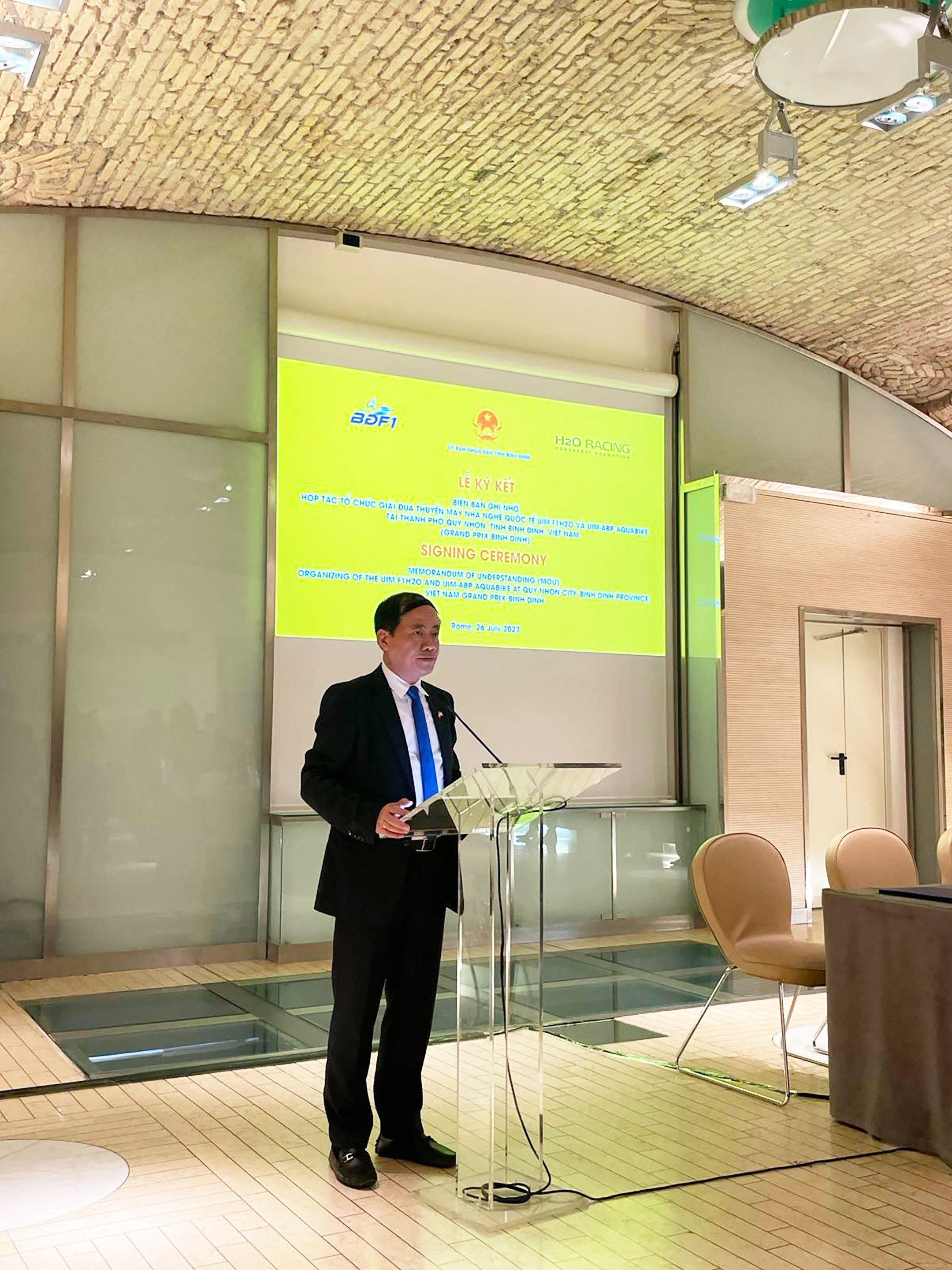 Phát biểu tại buổi Lễ, ông Phạm Anh Tuấn, Chủ tịch UBND tỉnh Bình Định cho biết: Với quyết tâm cao, nỗ lực vượt thời gian và cố gắng đáp ứng được đầy đủ các yêu cầu cao về kỹ thuật và điều kiện tự nhiên, Bình Định đã được chọn là nơi tổ chức 2 giải đua nổi tiếng thế giới F1H2O và Mô tô nước Aquabike. Đây thực sự là cơ hội cho Bình Định trở thành điểm đến quốc tế không thể thiếu cho người yêu thể thao trên toàn thế giới, là động lực thúc đẩy thu hút đầu tư, phát triển kinh tế, xã hội và du lịch trong và ngoài nước một cách hiệu quả, và đưa Việt Nam hiện diện trên bản đồ quốc tế trong giải đấu quốc tế chuyên nghiệp đầy thử thách này.
