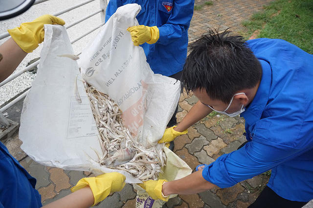 Trong sáng nay (9/7) các công nhân môi trường tiếp tục vớt cá. Hiện tượng cá chết xuất hiện từ ngày hôm qua.