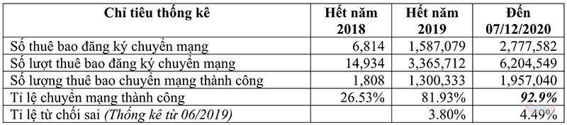 Theo báo cáo kết quả sau hai năm triển khai dịch vụ MNP, từ năm 2018 đến ngày 07/12/2020, số thuê bao đăng ký chuyển mạng từ 6.814 thuê bao lên 2.777.582 thuê bao. Số lượng thuê bao chuyển mạng thành công 1.808 thuê bao lên 1.957.040 thuê bao. Theo đó, tỉ lệ chuyển mạng thành công là 92,9%. Tỉ lệ từ chối sai (Thống kê từ 06/2019) từ 3,80% lên 4,49%.