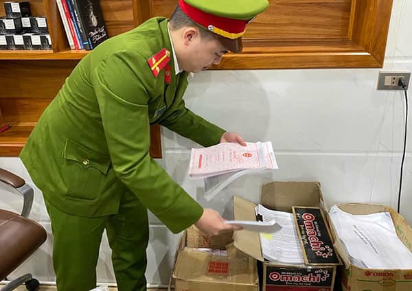 Khám xét khẩn cấp tại các địa điểm, lực lượng Công an thu giữ số lượng lớn hóa đơn, chứng từ thu nộp ngân sách nhà nước, nhiều con dấu của các doanh nghiệp, cùng nhiều vật chứng liên quan.