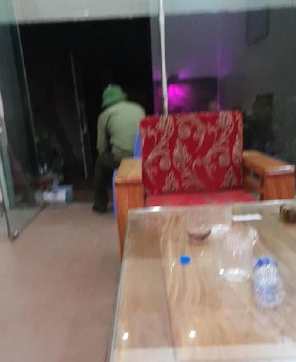 | Một vài người đàn ông mặc áo thương binh ngồi chặn giữa cửa không cho chị Hưởng đi ra ngoài (ảnh do nhân vật cung cấp) |