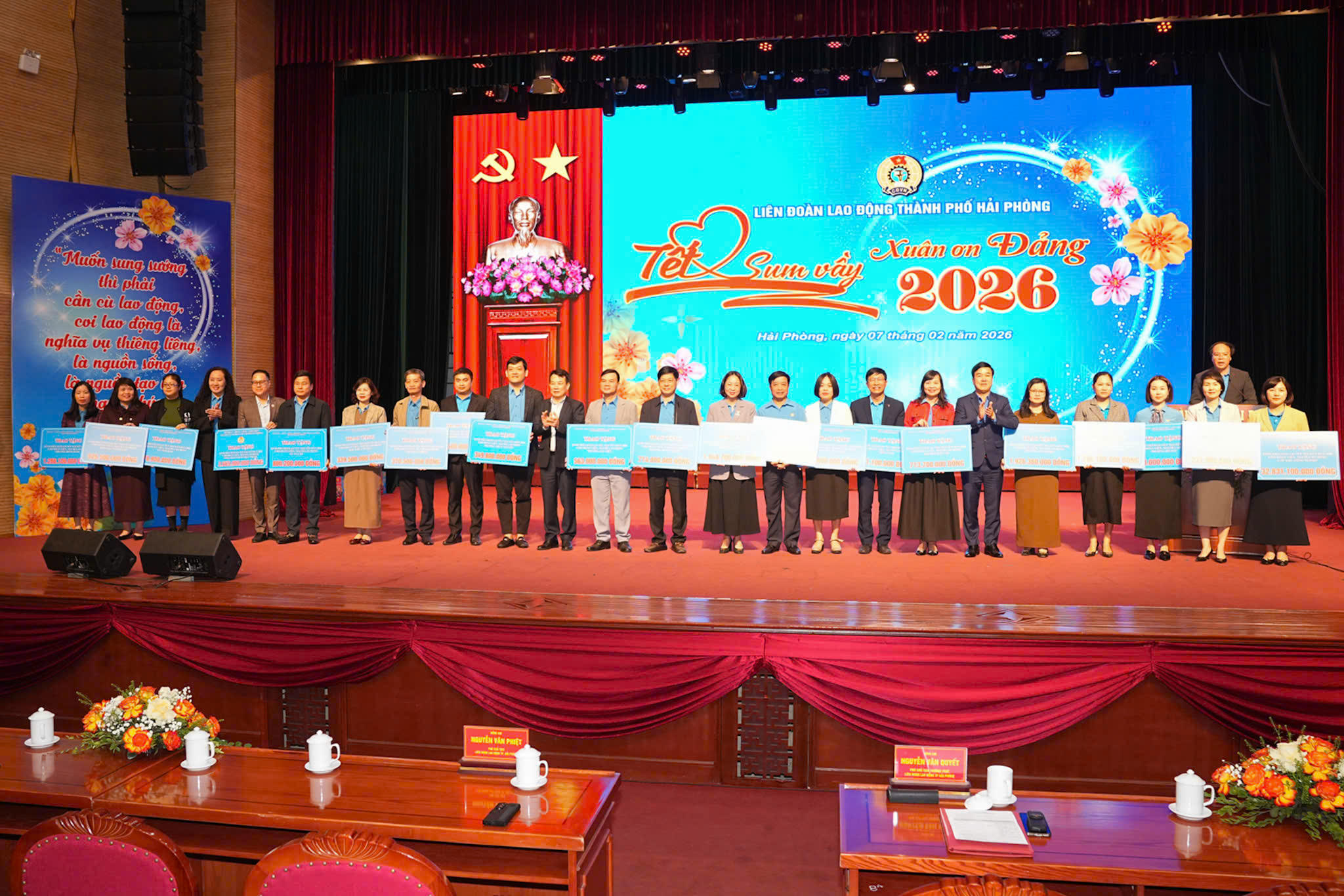 Nhân dịp này, lãnh đạo Đảng, Nhà nước, Ủy ban MTTQ Việt Nam, các Ủy ban của Quốc hội, Tổng Liên đoàn Lao động Việt Nam trao tặng 750 túi quà bằng hiện vật và 750 suất quà bằng tiền mặt với tổng kinh phí 1,275 tỷ đồng. Thành ủy, UBND TP Hải Phòng chi 11,8 tỉ đồng trợ cấp 11.800 người lao động hoàn cảnh khó khăn. Liên đoàn Lao động TP chi các hoạt động chăm lo Tết cho đoàn viên với số tiền hơn 49,6 tỷ đồng.