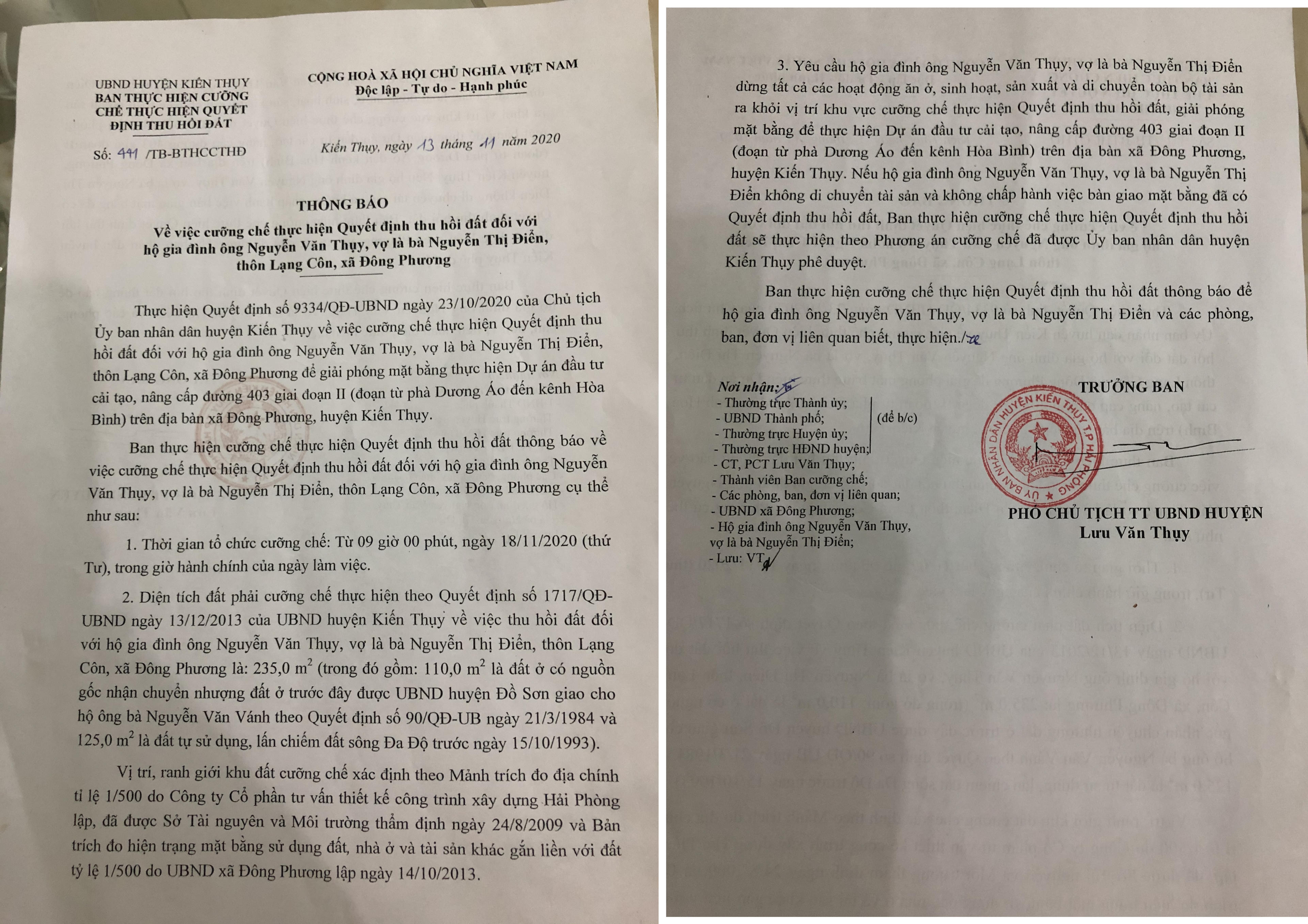 Ngày 13/11/2020, Ban thực hiện cưỡng chế thực hiện quyết định thu hồi đất UBND huyện Kiến Thụy ban hành thông báo số 441 về việc cưỡng chế thực hiện quyết định thu hồi đất đối với hộ gia đình ông Nguyễn Văn Thụy, vợ là bà Nguyễn Thị Điển tại thôn Lạng Côn, xã Đông Phương, huyện Kiến Thụy.