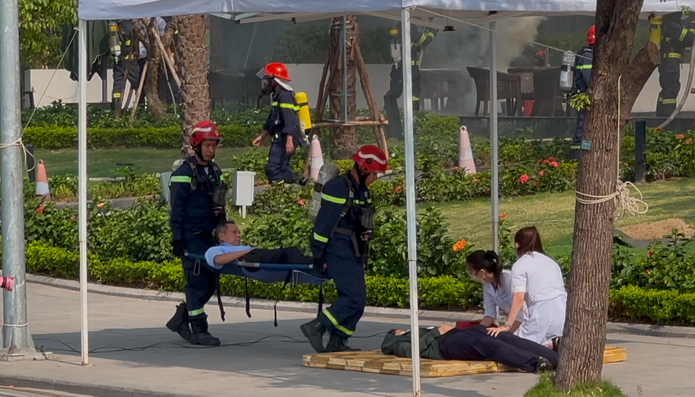 Cháy lan nhanh đã khiến 02 xe ô tô di chuyển trong tầng hầm va vào nhau, gây tắc nghẽn lối ra, khiến 06 người mắc kẹt trong xe. Đồng thời, hệ thống loa báo cháy và thông báo gặp sự cố, gây hoảng loạn cho nhiều nhân viên và khách hàng trong tòa nhà. Một số người vội vã chạy vào thang máy để thoát ra ngoài, nhưng thang máy gặp sự cố dừng đột ngột giữa các tầng, khiến 08 người mắc kẹt trong cabin.