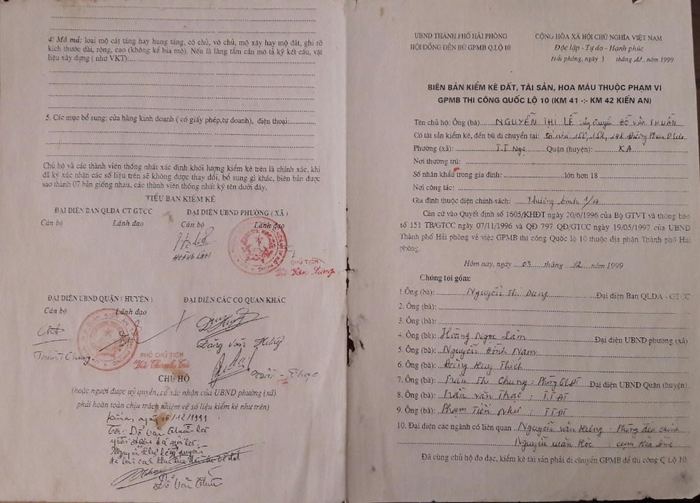 Theo các tài liệu ông Thuần cung cấp, ngày 3/12/1999, biên bản kiểm kê đất, tài sản, hoa màu thuộc phạm vi giải phóng thi công Quốc lộ 10 (Km41 đến Km42 – Kiến An) cho hộ gia đình cụ Nguyễn Thị Lễ tại số nhà 152, 150, 148 đường Phan Đăng Lưu, phường Trần Thành Ngọ được lập với xác nhận của đại diện UBND phường Trần Thành Ngọ, UBND quận Kiến An và đại diện chủ hộ gia đình.