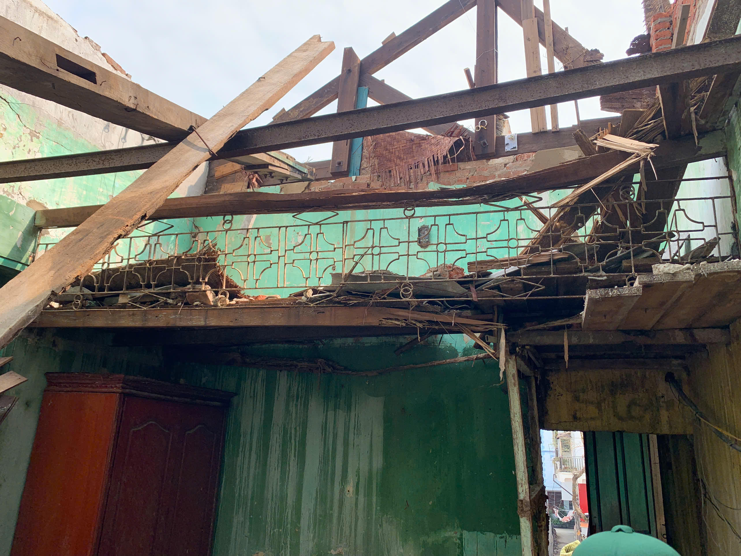 Công trình bị tốc mái, thủng trần kèm nguy cơ cao đổ sập cao. |