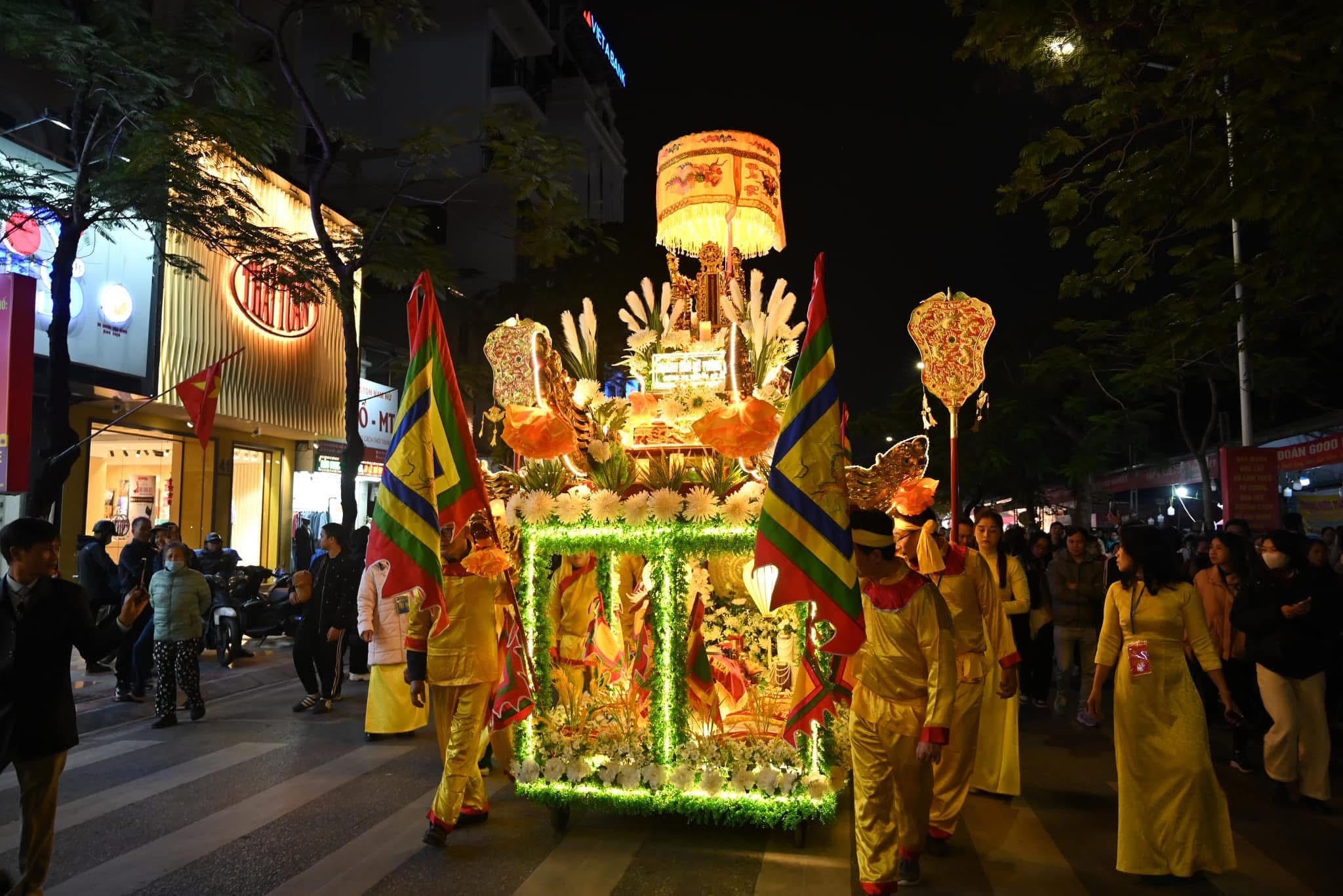 | Các đoàn rước xuất phát từ Đền Nghè và Đình An Biên đi qua các tuyến phố về khu vực trước Tượng đài Nữ tướng Lê Chân. |