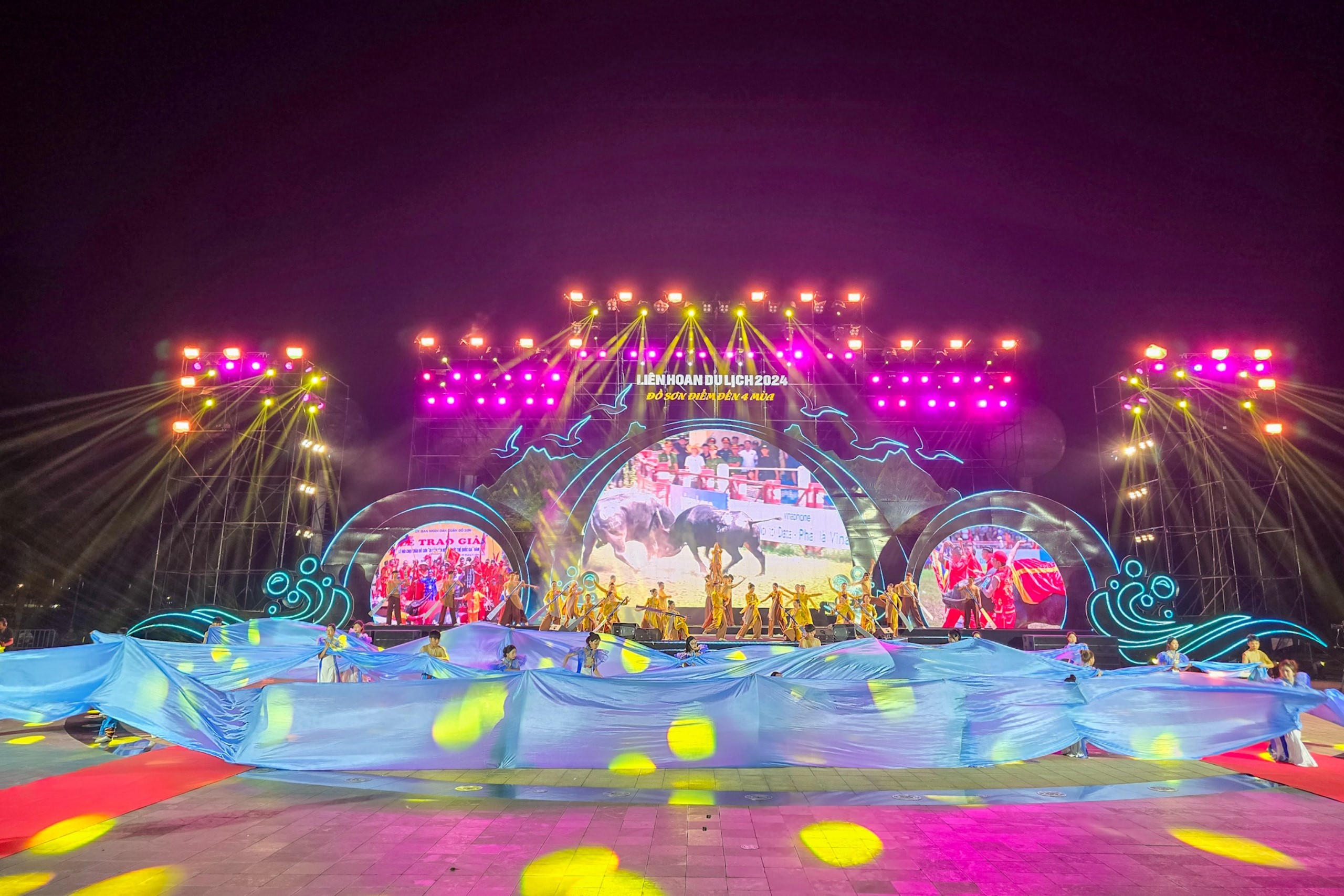Chương trình nghệ thuật Liên hoan du lịch 2024 “Đồ Sơn - Điểm đến 4 mùa” mở đầu bằng màn nghệ thuật được dàn dựng công phu với những vũ đạo tái hiện vùng đất, con người Đồ Sơn – Hải Phòng mang tinh thần đất Việt hào khí ngàn năm cùng không khí rộn rã tưng bừng của ngày hội biển.