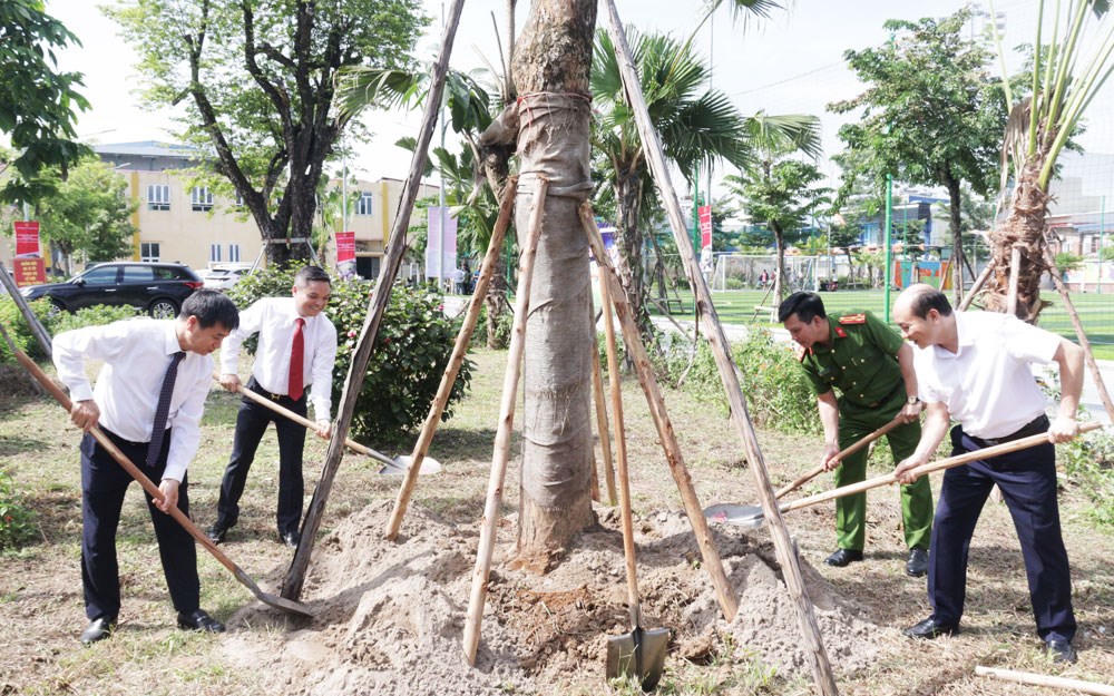 Lãnh đạo quận Lê Chân trồng cây tại công viên. |