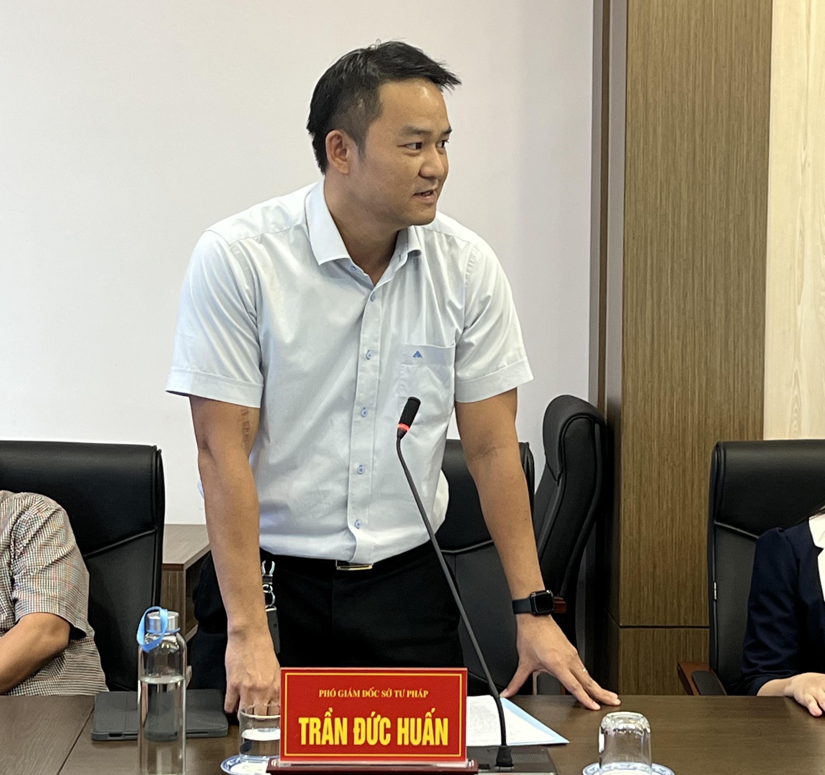 Phó Giám đốc Sở Tư pháp Trần Đức Huấn phát biểu tại hội nghị. |