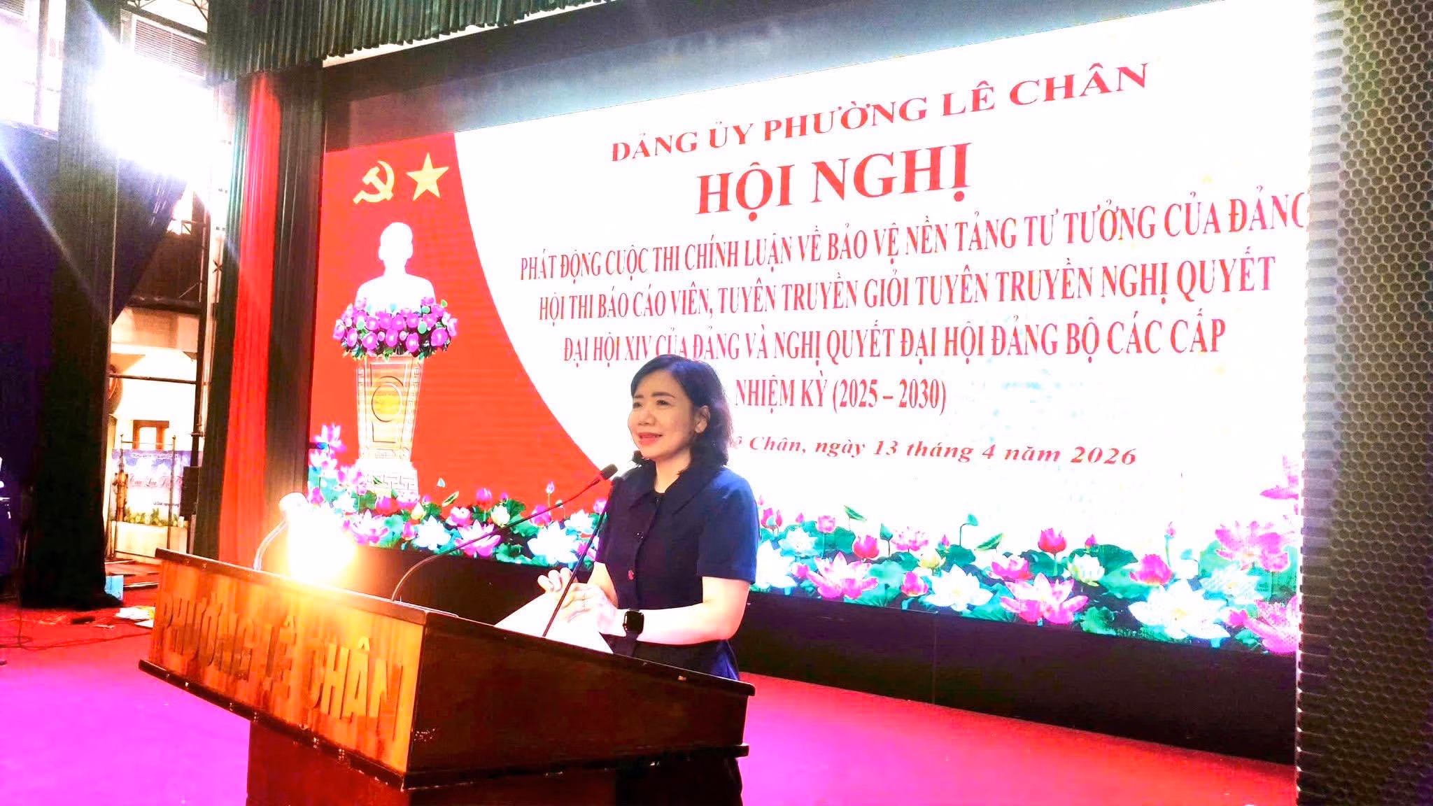 Tại hội nghị, Phó Bí thư Thường trực Đảng ủy phường Lê Chân Nguyễn Thị Minh Ngọc đã triển khai kế hoạch tổ chức Cuộc thi chính luận về bảo vệ nền tảng tư tưởng của Đảng năm 2026 và Hội thi Báo cáo viên, Tuyên truyền viên giỏi, góp phần nâng cao chất lượng công tác tuyên truyền, lan tỏa sâu rộng Nghị quyết Đại hội XIV của Đảng và nghị quyết đại hội đảng bộ các cấp.