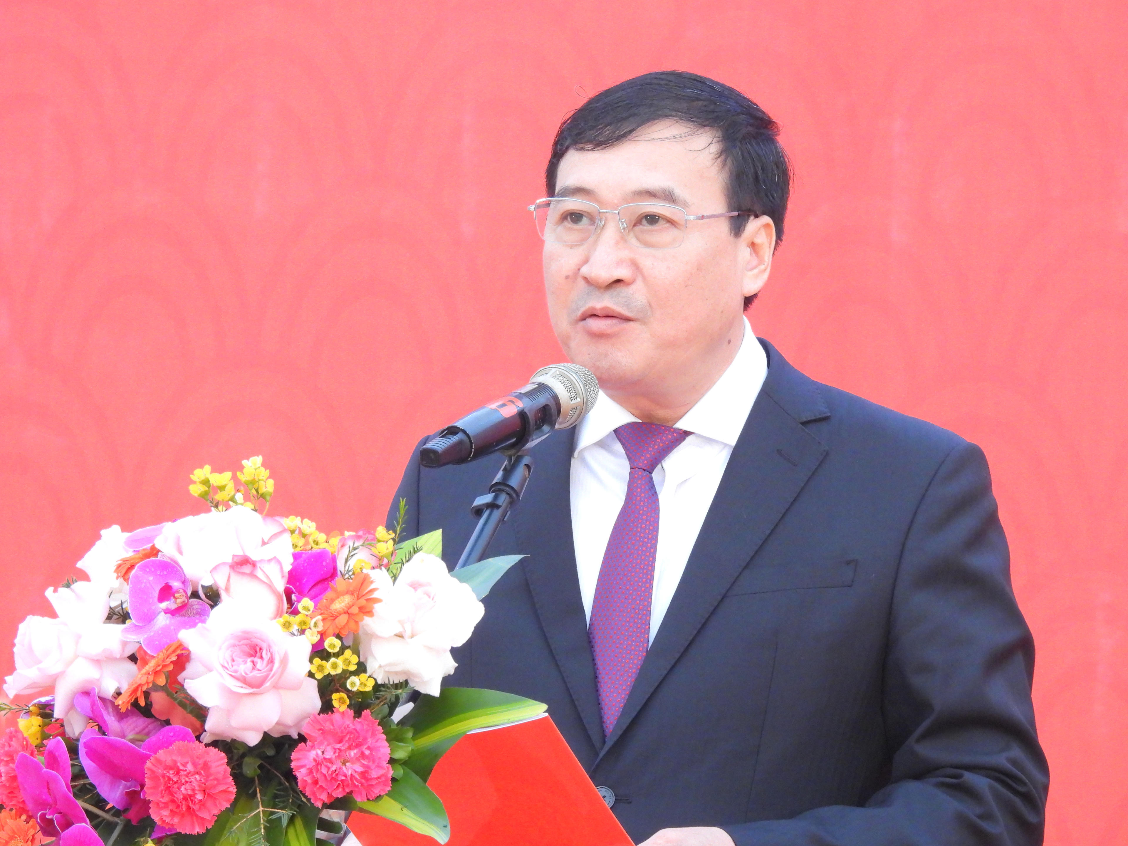 Ông Đào Văn Vũ - Phó Chủ tịch UBND huyện Vân Đồn phát biểu tại Hội chợ hoa đào và sinh vật cảnh năm 2025. |