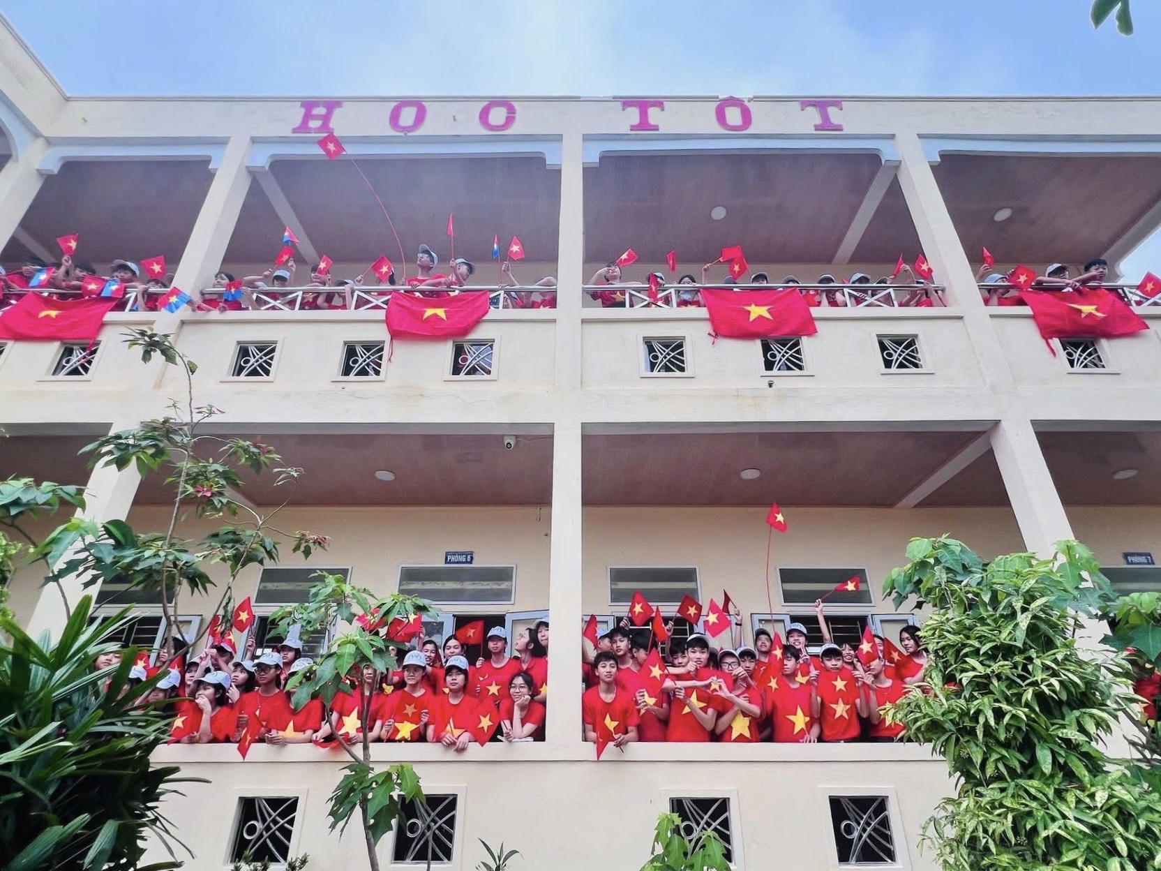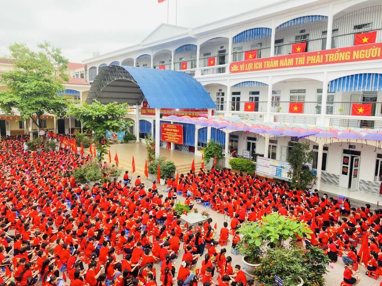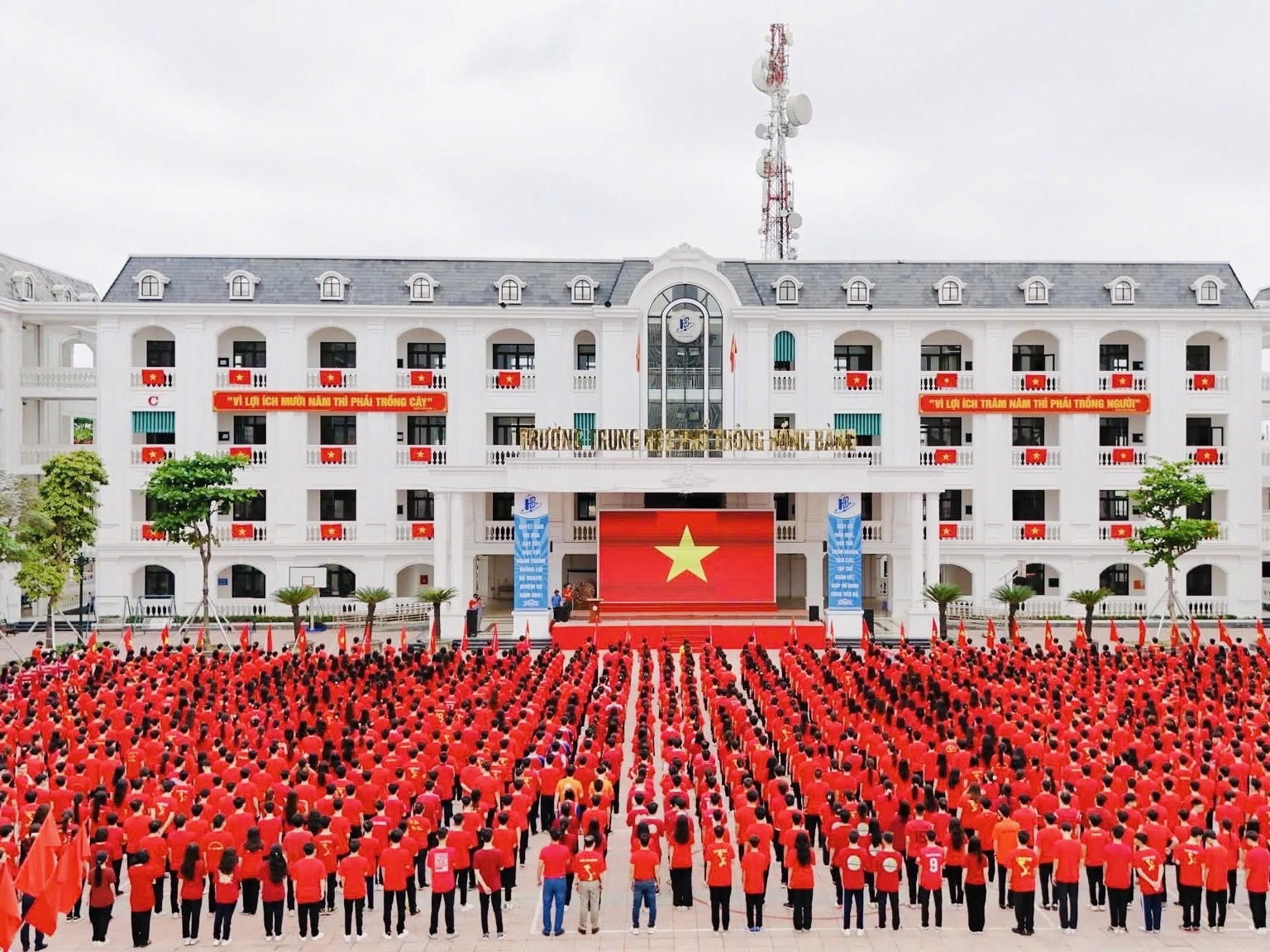 Sân trường ngập tràn sắc đỏ của những lá cờ Tổ quốc và đồng phục áo cờ đỏ sao vàng tại trường THPT Hồng Bàng